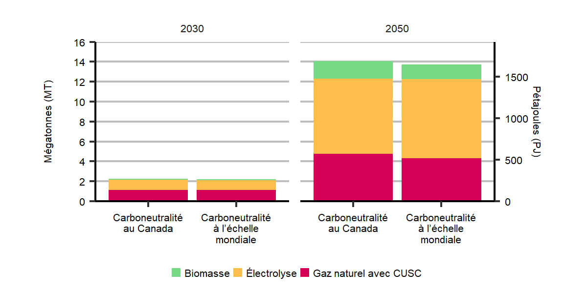 Description : Ces graphiques à colonnes empilées montrent la production d’hydrogène selon le type en 2030 et 2050 dans les deux scénarios de carboneutralité. La production est ventilée par type, ce qui comprend la biomasse, l’électrolyse et le gaz naturel avec CUSC.