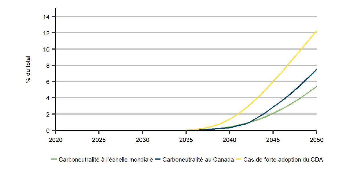 Dans cette simulation, le CDA dépasse de 2 % la réduction totale des émissions au début des années 2040 et atteint le même niveau au milieu des années 2040 dans les deux scénarios de carboneutralité. La part des émissions augmente ensuite rapidement dans les deux scénarios et dans la simulation de forte adoption du CDA. D’ici 2050, le CDA compte pour environ 5 % des réductions d’émissions dans le scénario de carboneutralité à l’échelle mondiale, 7 % dans le scénario de carboneutralité du Canada et 12 % dans la simulation de forte adoption du CDA.