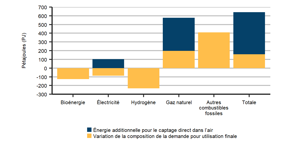 Le recours accru au CDA se répercute sur l’ensemble de la filière énergétique. En premier lieu, l’augmentation des émissions négatives découlant du CDA atténue la pression sur d’autres secteurs pour réduire leurs propres émissions par rapport à un objectif de carboneutralité tirant profit d’une moins grande quantité d’émissions négatives. En second lieu, les procédés de CDA exigent eux-mêmes de grandes quantités d’énergie. Dans le cas d’une forte adoption du CDA, on a besoin de davantage de gaz naturel et d’électricité pour exploiter les installations de CDA.