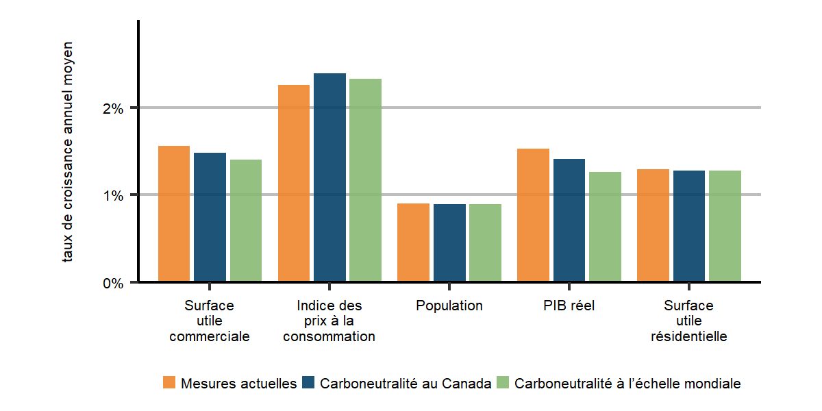 Ces indicateurs demeurent comparables d’un scénario à l’autre. Pendant la période de projection, l’espace de plancher commercial et résidentiel augmente d’environ 1,5 % par année. L’indice des prix à la consommation augmente d’un peu plus de 2 %, tandis que la population augmente d’un peu moins de 1 % par année en moyenne et le PIB réel, de 1 % à 2 %.