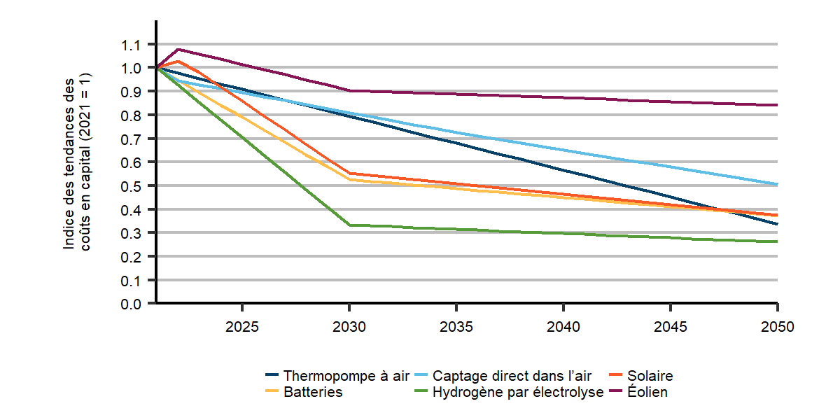 Description : Ce graphique linéaire présente l’évolution des tendances concernant les coûts en capital des principales technologies durant la période de projection dans le scénario de carboneutralité à l’échelle mondiale (2021=1). Ces technologies sont les thermopompes à air, le captage direct dans l’air, l’énergie solaire, les batteries, l’hydrogène par électrolyse et l’énergie éolienne.