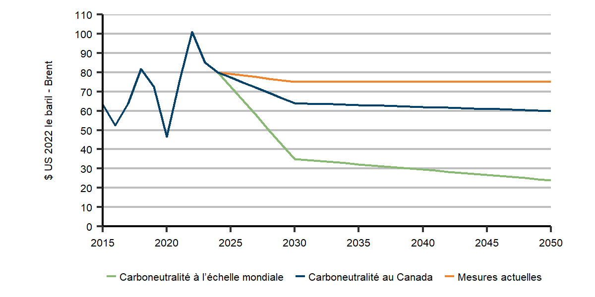 - Scénario de carboneutralité au Canada : L’action climatique mondiale s’intensifie, mais moins rapidement. La demande mondiale de pétrole brut et les prix du pétrole brut baissent, mais moins que dans le scénario de carboneutralité à l’échelle mondiale.