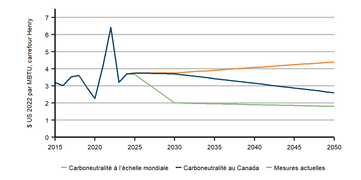 - Scénario de carboneutralité au Canada : L’action climatique mondiale s’intensifie, mais moins rapidement. La demande mondiale de gaz naturel et les prix du gaz naturel baissent, mais moins que dans le scénario de carboneutralité.