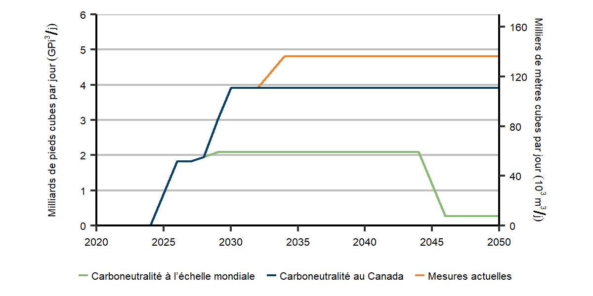 Dans le scénario des mesures actuelles, les exportations de GNL s’élèvent à 4,6 Gpi³/j (131,4 10³m³/j) en 2034, niveau auquel elles se maintiennent jusqu’en 2050. Dans nos trois scénarios, nous posons comme hypothèse que la totalité des exportations de GNL se fait à partir de la côte ouest du Canada. La mise en valeur future de projets de GNL est incertaine et pourrait être très différente de celle envisagée.
