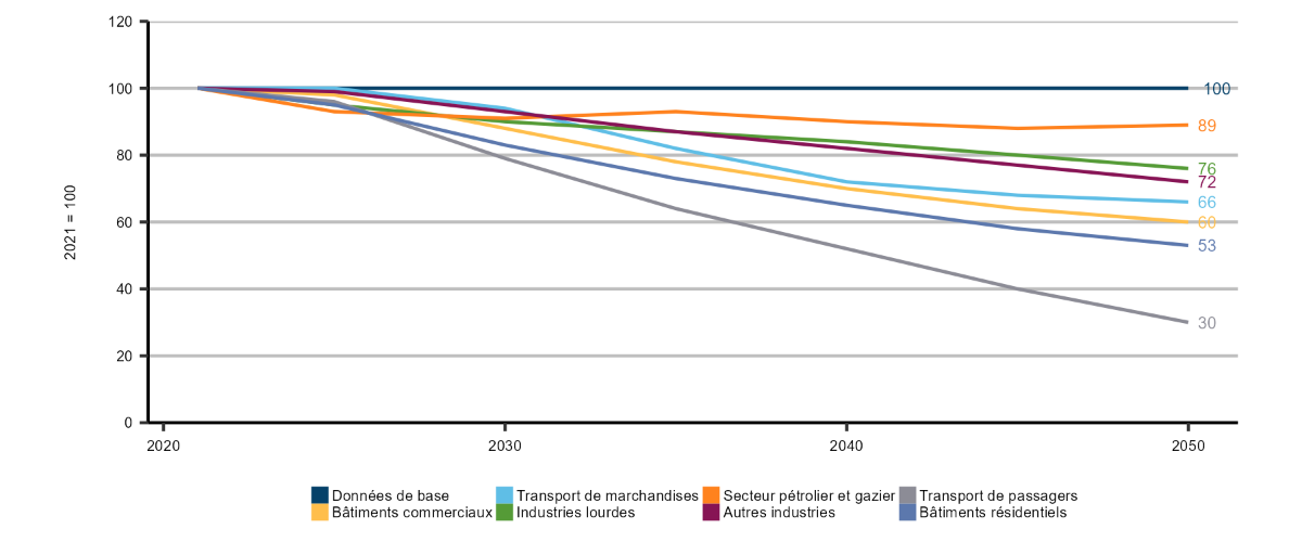 Description : Ce graphique linéaire illustre les tendances observées au niveau de l’intensité énergétique (indexée à 100), par sous secteur d’utilisation finale, de 2021 à 2050, selon le scénario de carboneutralité à l’échelle mondiale. Le transport de passagers est le sous secteur où la diminution de l’intensité énergétique est la plus marquée, à 30 en 2050 (une chute de 70 % par rapport aux niveaux de 2021), tandis que dans le transport de marchandises, elle est beaucoup plus faible, à 66 en 2050. L’intensité énergétique pour les bâtiments résidentiels et commerciaux décline à 60 et 53 respectivement. Les autres industries, l’industrie lourde et le pétrole et le gaz présentent le recul le plus faible de l’intensité énergétique, à 72, 76 et 89 respectivement.