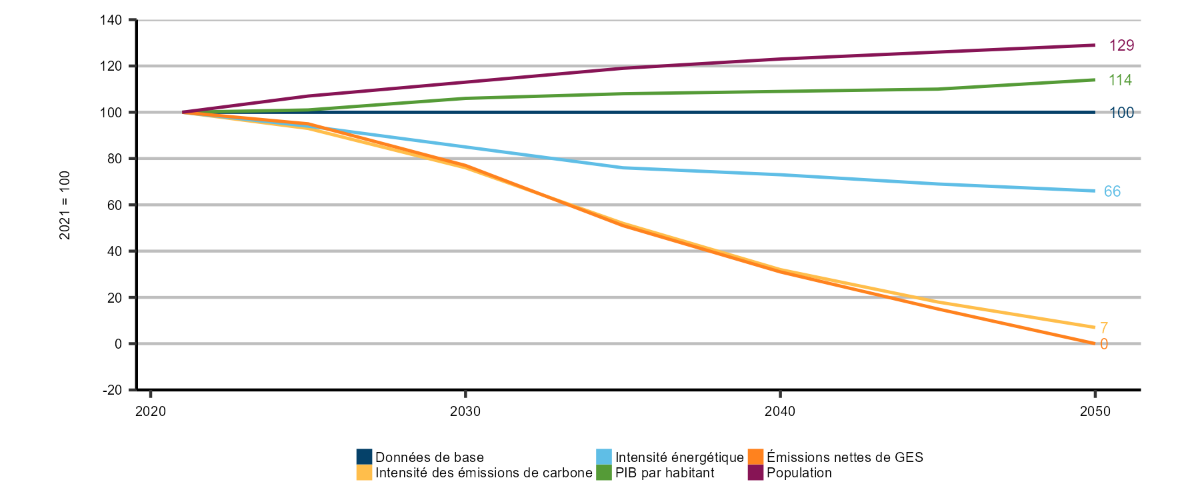Description : Ce graphique linéaire illustre, selon le scénario de carboneutralité à l’échelle mondiale, les tendances observées quant aux principaux déterminants des émissions de gaz à effet de serre (« GES »), ou équation de KayaDéfinition*, notamment la croissance démographique, le niveau de vie (produit intérieur brut par habitant [PIB par habitant]), l’intensité énergétique (consommation d’énergie par niveau de PIB) et l’intensité en carbone (la mesure dans laquelle l’énergie dégage des émissions). Les tendances à l’horizon 2050 sont présentées sous forme d’indice par rapport aux niveaux de 2021, où 2021 = 100. Par exemple, la population canadienne, à 129 en 2050, sera 29 % plus importante qu’en 2021. Les autres valeurs indexées en 2050 sont 114 pour le PIB par habitant (augmentation de 14 %), 66 pour l’intensité énergétique (diminution de 44 % par rapport à 2021), 7 pour l’intensité en carbone et 0 pour les émissions nettes de GES.