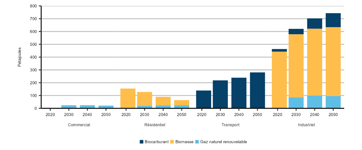 Description : Ce graphique à barres empilées illustre la demande de bioénergie dans les quatre secteurs d’utilisation finale du Canada selon le scénario de carboneutralité à l’échelle mondiale. Différents types et compositions de bioénergies sont utilisés pour chaque secteur selon l’utilisation finale qu’il en fait. De 2021 à 2050, la demande totale en bioénergie s’accroît de presque 30 %, soit de 761 PJ à 1 065 PJ. Les secteurs commercial et résidentiel utilisent le moins de bioénergie, en grande partie sous forme de gaz naturel renouvelable mélangé au gaz naturel qui circule dans l’infrastructure actuelle. Le secteur résidentiel, à mesure que progresse son électrification, connaît une diminution de la biomasse utilisée pour les poêles à bois. Le secteur des transports utilise des biocarburants et représente près de 300 PJ, soit 25 % de la demande totale en bioénergie en 2050. Le secteur industriel est celui qui utilise le plus de bioénergie, et il représentera 65 % de la demande totale d’ici 2050. En raison de la nature diversifiée des industries et procédés de production au Canada, divers types de bioénergies répondent à la demande dans ce secteur.