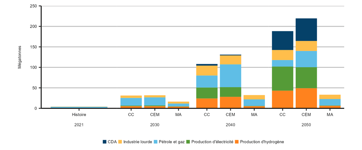 Description : Ce graphique à barres empilées illustre la quantité totale de carbone capté, utilisé et stocké par secteur et scénario, les solutions naturelles non comprises. Dans tous les scénarios, le captage, l’utilisation et le stockage du carbone (« CUSC ») augmentent jusqu’en 2050, et la contribution de chaque secteur change au fil du temps et selon le scénario. Le scénario des mesures actuelles présente le CUSC le plus faible au fil du temps, avec 33 Mt en 2050. La plus grande part de CUSC se fait dans le secteur pétrolier et gazier. D’ici 2050, le CUSC sera de 220 Mt selon le scénario de carboneutralité du Canada et de 180 Mt selon le scénario de carboneutralité à l’échelle mondiale. Bien que le CUSC dans le secteur pétrolier et gazier constitue une part importante de cette activité en 2030 selon les deux scénarios, sa proportion est plus importante dans le scénario de carboneutralité du Canada en 2040 et 2050 que dans le scénario de carboneutralité à l’échelle mondiale. Cela s’explique par une baisse plus marquée de la production de pétrole et de gaz dans le scénario de carboneutralité à l’échelle mondiale. Dans les deux scénarios, le captage direct dans l’air (« CDA »), la production d’électricité et la production d’hydrogène représentent plus de 70 % du CUSC total en 2050. Dans le scénario de carboneutralité à l’échelle mondiale, ces secteurs comptent pour 7 Mt de CUSC de moins que dans le scénario de carboneutralité du Canada en raison de la quantité moindre d’émissions compensatoires requises selon ce scénario.