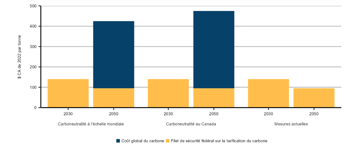 Description : Ce graphique à barres empilées illustre deux composantes de la tarification du carbone, par scénario, en 2030 et 2050, en dollars canadiens de 2022 (ou rajustés en fonction de l’inflation) par tonne d’équivalent en dioxyde de carbone (« $ CA de 2022 par tonne d’éq. CO2 »). La composante du filet de sécurité fédéral sur la tarification du carbone est la même dans tous les scénarios et passe de 50 $ en 2022 à 140 $ en 2030 (170 $ nominaux). Après 2030, la tarification du carbone est présumée être établie en termes nominaux, ce qui explique le recul à 95 $ du prix rajusté en fonction de l’inflation en 2050. La seconde composante est celle du coût global du carbone, qui est établi en tenant compte d’un ensemble hypothétique de politiques, de règlements et de programmes nécessaires pour atteindre zéro émission nette de GES au Canada d’ici 2050. Cette composante passe de 0 $ en 2030 à 330 $ en 2050 dans le scénario de carboneutralité à l’échelle mondiale et à 380 $ en 2050 dans le scénario de carboneutralité du Canada.