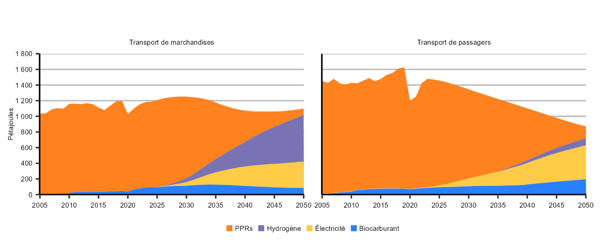 Figure 7 – Consommation d’énergie, transport de passagers et de marchandises, scénario de carboneutralité à l’échelle mondial