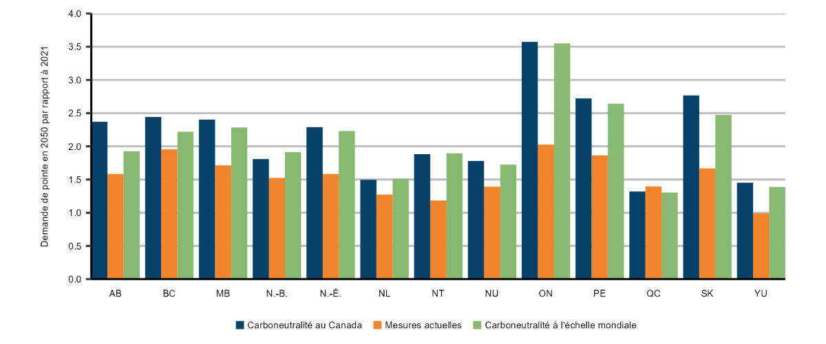 Description : Ce diagramme à barres illustre l’ampleur relative de la demande de pointe d’électricité selon différents scénarios pour 2050 comparativement à la demande de pointe observée en 2021, pour chaque province et territoire. La demande de pointe d’électricité est influencée par la croissance économique et démographique. Cependant, dans les scénarios de carboneutralité, sa croissance est beaucoup plus forte dans la plupart des régions en raison l’électrification accrue. Par exemple, dans le scénario de carboneutralité à l’échelle mondiale, la demande de pointe d’électricité en 2050 peut être de 1,3 à 3,6 fois plus élevée qu’en 2021, selon la région. L’Ontario affiche la plus forte croissance de la demande de pointe dans tous les scénarios, en raison de l’importance de sa population et de son économie. Les scénarios de carboneutralité prévoient généralement une croissance plus forte de la demande de pointe dans toutes les régions, sauf au Québec. Au Québec, cette croissance est plus faible dans les scénarios de carboneutralité que dans le scénario des mesures actuelles en raison de l’amélioration de l’efficacité énergétique des bâtiments résidentiels et commerciaux. Cette amélioration de l’efficacité est principalement attribuable à l’adoption répandue de thermopompes pour le chauffage des bâtiments. En revanche, le scénario des mesures actuelles repose principalement sur des plinthes chauffantes dont le rendement énergétique est plus faible pour le chauffage des bâtiments.