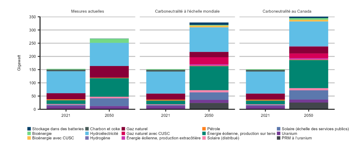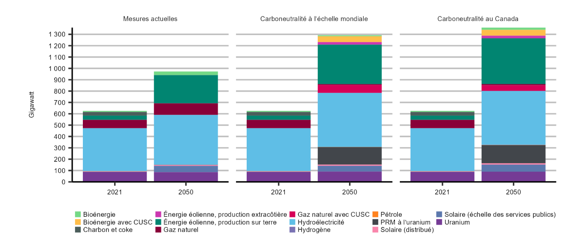 Description : Ce graphique à colonnes empilées illustre la production d’électricité selon le combustible en 2021 et en 2050 dans les trois scénarios prévisionnels. Les types de combustibles sont la biomasse, la géothermie, l’hydroélectricité, le pétrole, l’uranium, le charbon et le coke, le gaz naturel, l’énergie solaire et l’éolien. En 2021, la production totale d’électricité s’élevait à 625 TWh; en 2050, elle passe à 973 TWh dans le scénario des mesures actuelles, à 1 360 TWh dans le scénario de carboneutralité du Canada et à 1 292 TWh dans le scénario de carboneutralité à l’échelle mondiale. Dans les trois scénarios, l’énergie hydroélectrique demeure une des principales sources d’approvisionnement en électricité, représentant 378 TWh en 2021, atteignant 440 TWh dans le scénario des mesures actuelles, 474 TWh dans le scénario de carboneutralité du Canada et 476 TWh dans le scénario de carboneutralité à l’échelle mondiale. Dans tous les scénarios, c’est l’éolien qui connaît la plus forte croissance. En 2021, l’énergie éolienne n’a contribué que 35 TWh à la production totale. En 2050, elle passe à 248 TWh dans le scénario des mesures actuelles, à 425 TWh dans le scénario de carboneutralité du Canada et à 370 TWh dans le scénario de carboneutralité à l’échelle mondiale. L’électricité produite à partir de petits réacteurs modulaires contribue grandement à la production d’électricité dans les scénarios de carboneutralité. D’ici 2050, l’électricité ainsi produite atteint 160 TWh dans le scénario de carboneutralité du Canada et 155 TWh dans le scénario de carboneutralité à l’échelle mondiale. Dans chacun des trois scénarios, la production d’énergie solaire décentralisée et à des fins commerciales a plus que décuplé. En 2050, l’approvisionnement en électricité à partir de ces sources s’élève à 63 TWh dans le scénario des mesures actuelles, à 75 TWh dans le scénario de carboneutralité du Canada et à 62 TWh dans le scénario de carboneutralité à l’échelle mondiale.