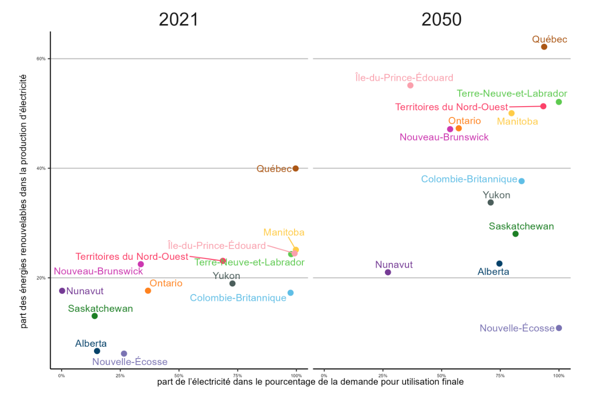 Description : Ce graphique compare la demande d’électricité et la production d’électricité à partir de sources renouvelables dans le scénario de carboneutralité pour toutes les régions en 2021 et 2050. L’axe vertical représente le pourcentage de la demande d’électricité pour utilisation finale, tandis que l’axe horizontal correspond au pourcentage de l’énergie renouvelable utilisée produire de l’électricité. En 2021, dans toutes les régions mis à part le Québec, c’est moins de 30 % de la demande pour utilisation finale qui a été satisfaite au moyen d’électricité. Cependant, un virage s’opère en 2050. Le Nouveau Brunswick, l’Ontario, le Manitoba, les Territoires du Nord Ouest, Terre Neuve et Labrador, l’Île du Prince Édouard et le Québec satisfont à plus de 40 % de la demande pour utilisation finale au moyen d’électricité. En 2021, seuls le Québec, l’Île du Prince Édouard, le Manitoba, Terre Neuve et Labrador, le Yukon et la Colombie Britannique ont utilisé des énergies renouvelables pour produire de l’électricité. Un changement important se produit en 2050. Toutes les régions, sauf le Nunavut et l’Île du Prince Édouard, produisent plus de 50 % de leur électricité à partir de sources renouvelables. Ce graphique illustre l’évolution à la fois de la consommation d’électricité et de la production d’énergie renouvelable. D’ici 2050, la proportion d’électricité produite augmentera pour répondre à la demande accrue pour utilisation finale. La proportion d’électricité produite à partir de sources renouvelables s’intensifiera également pour répondre à cette demande croissante.