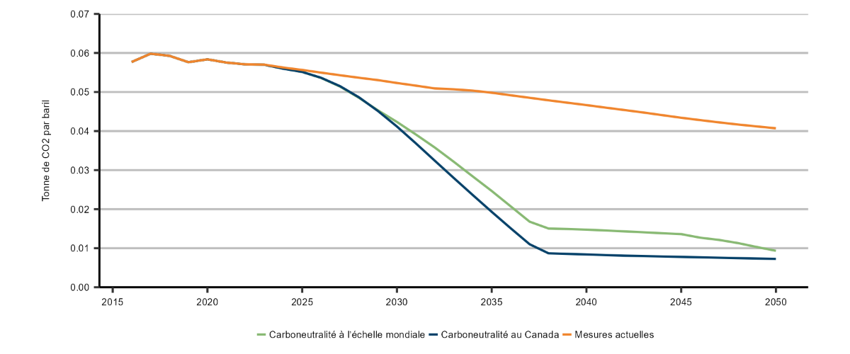 Description : Ce graphique linéaire illustre l’intensité des émissions associées à la production tirée des sables bitumineux selon les trois scénarios prévisionnels. Dans tous ces scénarios, l’intensité des émissions de la production de bitume diminue après le sommet de 0,059 tonne par baril en 2018. Dans le scénario de carboneutralité à l’échelle mondiale, l’intensité des émissions diminue rapidement à partir du milieu des années 2020, passant à 0,015 en 2038, puis à 0,009 en 2050. Il en va de même dans le scénario de carboneutralité à l’échelle mondiale, où elle fléchit à 0,008 en 2038, puis ne diminue que légèrement pour s’établir à 0,007 en 2050. Dans le scénario des mesures actuelles, l’intensité des émissions s’affaiblit de façon constante tout au long de la période de projection jusqu’à 0,041 en 2050. Dans les scénarios de carboneutralité à l’échelle mondiale et du Canada, la baisse des émissions est en grande partie attribuable à l’adoption du CUSC dans les installations de sables bitumineux. Dans le scénario des mesures actuelles, elle découle principalement de l’amélioration de l’efficience.