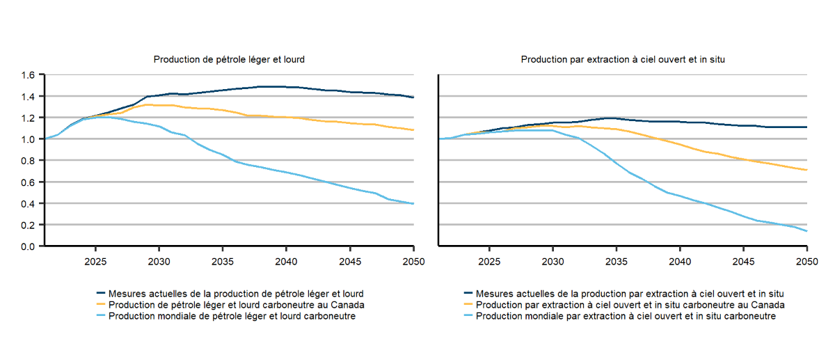 Description : Ces deux graphiques linéaires montrent la production indexée tirée des sables bitumineux par extraction à ciel ouvert et récupération in situ et la production indexée de pétrole lourd et léger classique. Dans le scénario de carboneutralité à l’échelle mondiale, la production passe à 1,08 en 2027, selon les valeurs de 2021 (dans le scénario de carboneutralité du Canada, à 1,12 en 2027, et dans le scénario des mesures actuelles, à 1,19 en 2029). La production à ciel ouvert et in situ chute à 0,14 en 2050 (dans le scénario de carboneutralité du Canada, à 0,71, et dans le scénario des mesures actuelles, à 1,11). La production de pétrole lourd et léger passe à 1,20 en 2026, selon les valeurs de 2021 (dans le scénario de carboneutralité du Canada, à 1,32 en 2029, et dans le scénario des mesures actuelles, à 1,49 en 2038), puis chute à 0,39 en 2050 (dans le scénario de carboneutralité du Canada, à 1,08, et dans le scénario des mesures actuelles, à 1,39).