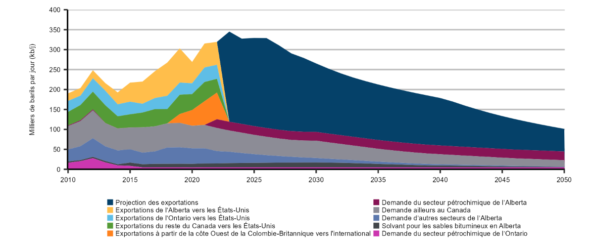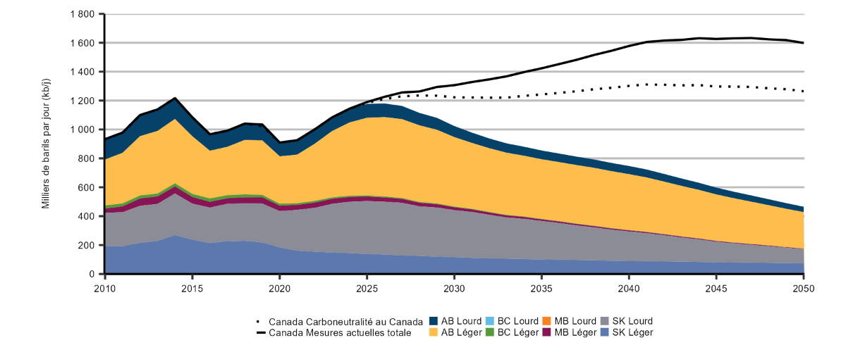 Figure 15 – Production de pétrole classique de l’Ouest canadien, de 2000 à 2050, scénario de carboneutralité à l’échelle mondiale