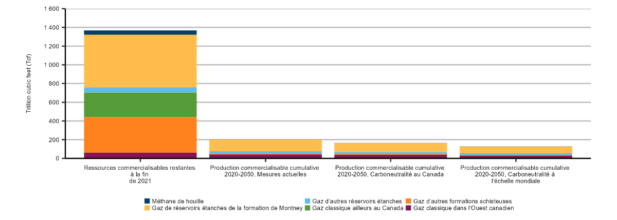 Description : La figure montre les ressources en gaz naturel au Canada à la fin de 2021 comparativement à la production cumulative de 2022 à 2050 pour chaque scénario. Les ressources de méthane de houille sont de 47 mille milliards de pieds cubes (« Tpi³ ») au total, celles de gaz naturel classique de l’Ouest canadien, de 61 Tpi³, et celles de gaz naturel classique provenant du reste du Canada, de 263 Tpi³. Les réservoirs étanches de Montney comptent 561 Tpi³ de ressources et les autres réservoirs étanches renferment 56 Tpi³. Les ressources des formations schisteuses se chiffrent à 380 Tpi³. La production cumulative ne représente que 92 % des ressources disponibles à la fin de la période de projection en 2050 dans le scénario de carboneutralité à l’échelle mondiale (12 % dans le scénario de carboneutralité du Canada et 15 % dans le scénario des mesures actuelles).
