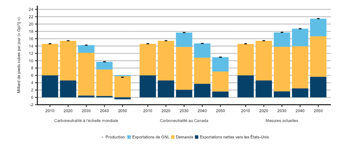Description : Ce graphique illustre la demande commercialisable, la production commercialisable, les exportations nettes vers les États Unis et les exportations de GNL de 2010 à 2050, par tranches de 10 ans, pour chaque scénario. La demande s’élève à 8,6 Gpi³/j en 2010, puis dégringole à 5,8 Gpi³/j dans le scénario de carboneutralité à l’échelle mondiale (à 5,5 Gpi³/j dans le scénario de carboneutralité du Canada et à 11,0 Gpi³/j dans le scénario des mesures actuelles). La production qui s’établissait à 14,6 Gpi³/j en 2010 est de 5,5 Gpi³/j dans le scénario de carboneutralité à l’échelle mondiale (11,0 Gpi³/j dans le scénario de carboneutralité du Canada et 21,5 Gpi³/j dans le scénario des mesures actuelles). En 2010, les exportations nettes s’élèvent à 6,0 Gpi³/j et diminuent à 0,5 Gpi³/j dans le scénario de carboneutralité à l’échelle mondiale (à 3,7 Gpi³/j dans le scénario carboneutralité du Canada et à 5,6 Gpi³/j dans le scénario des mesures actuelles). En 2010, les exportations de GNL sont nulles puis atteignent 0,3 Gpi³/j en 2050 dans le scénario de carboneutralité à l’échelle mondiale (3,9 Gpi³/j dans le scénario de carboneutralité du Canada et 4,8 Gpi³/j dans le scénario des mesures actuelles).
