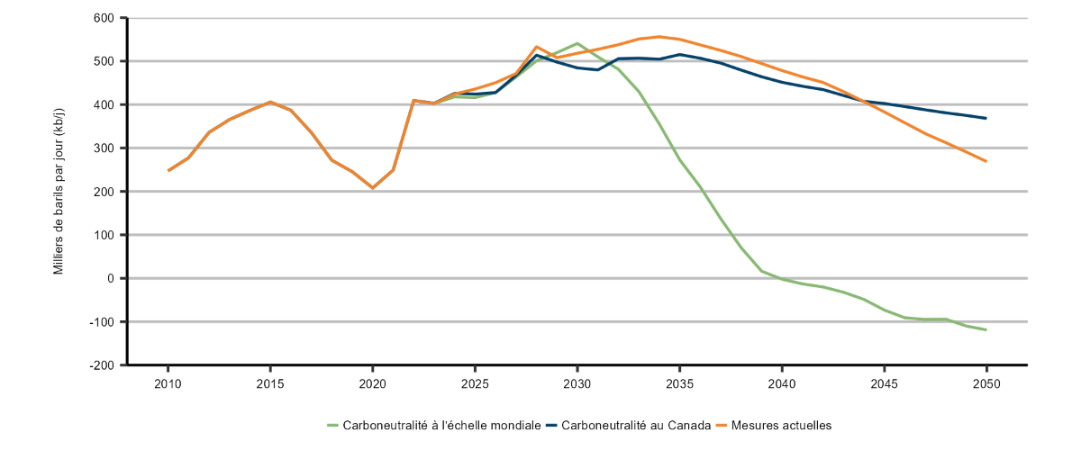 Figure 13 – Production tirée des sables bitumineux jumelée au CUSC, scénarios de carboneutralité à l’échelle mondiale et du Canada