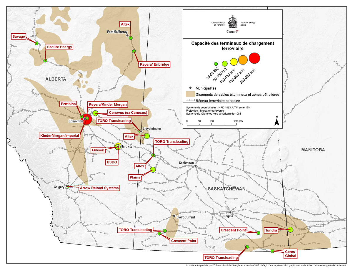 Dans le bassin sédimentaire de l’Ouest canadien (le « BSOC »), la capacité de chargement de pétrole brut à des fins de transport par rail s’élève à environ 1,2 million de barils par jourNote de bas de page 1. Le produit est expédié vers des raffineries des quatre coins de l’Amérique du Nord via plusieurs grands réseaux ferroviaires [anglais seulement]. Des installations spéciales, appelées terminaux de chargement ferroviaire, permettent de transborder le pétrole brut dans des wagons-citernes spécialement conçus, afin qu’il soit transporté par train. Quelque 60 % de la capacité de chargement totale dans le BSOC est concentrée dans le nord et le centre de l’Alberta, plus particulièrement dans les environs d’Edmonton et de Hardisty. Points de jonction de l’infrastructure de transport pétrolier, les deux villes sont devenues d’importants carrefours d’exportation de brut vers les États-Unis.