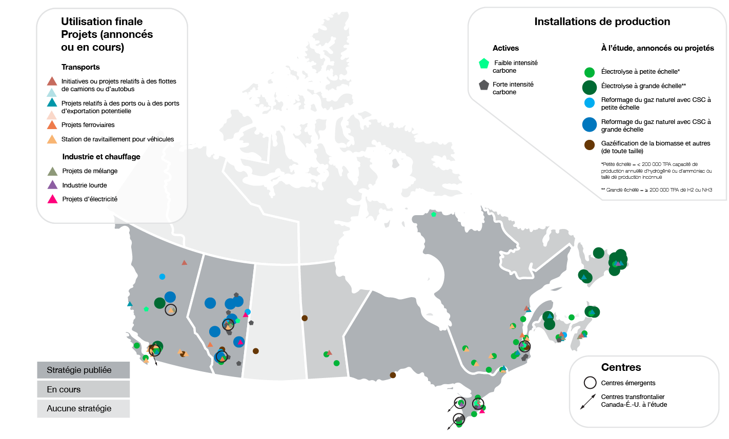 Figure 1 – Carte récapitulative : Changements survenus dans l’industrie de l’hydrogène au Canada depuis 2020 – Production, utilisation finale, carrefours et stratégies