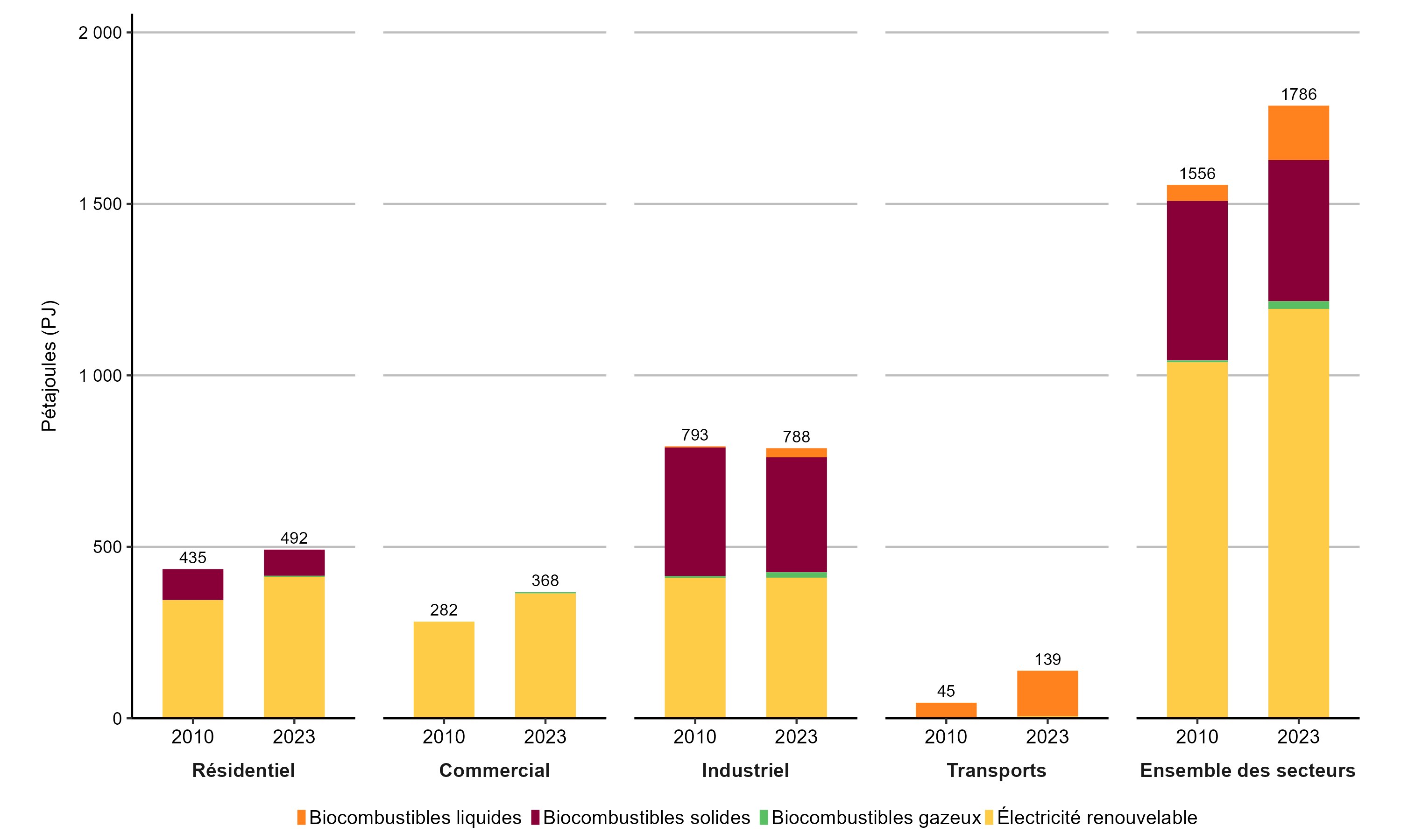 Version texte : Ce graphique à barres empilées illustre la demande estimative pour chaque type de carburant renouvelable (électricité renouvelable et biocombustibles solides, liquides et gazeux) dans les secteurs d’utilisation finale du Canada (bâtiments résidentiels et commerciaux, industrie et transports), ainsi que la demande totale pour l’ensemble des secteurs. La part des énergies renouvelables dans la demande pour utilisation finale est passée de 1 556 PJ en 2010 à 1 786 PJ en 2023, soit une augmentation de 15 % principalement attribuable à l’utilisation accrue de l’électricité et des biocombustibles liquides.