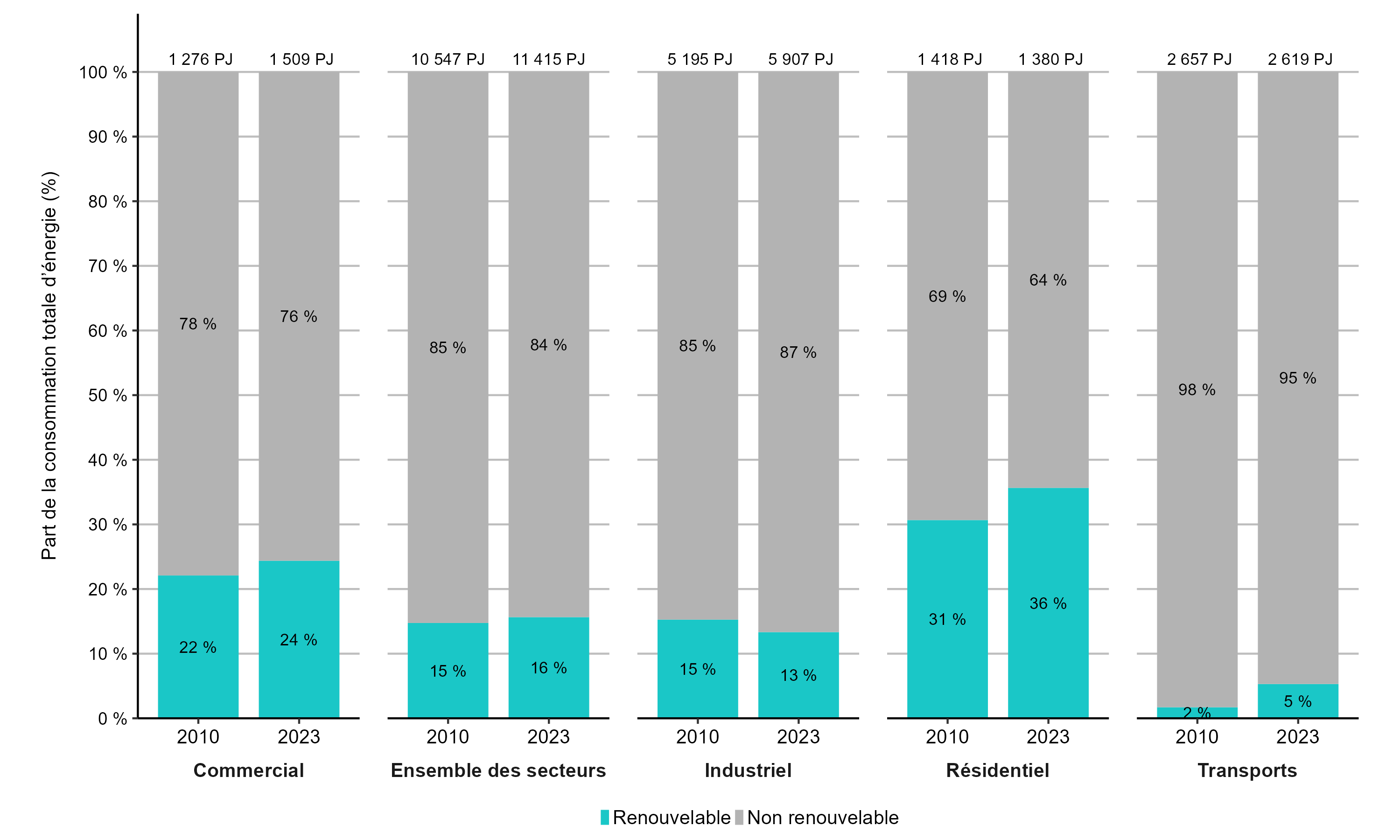 Version texte : Ce diagramme à barres illustre la part de l’énergie renouvelable, y compris l’électricité renouvelable et toutes les formes de biocombustibles, dans la demande totale pour utilisation finale par secteur en 2010 et en 2023. En 2023, les pourcentages les plus élevés ont été observés dans les secteurs résidentiel (36 %) et commercial (24 %), et le plus faible, dans le transport (5 %). Les chiffres du haut représentent la demande totale pour utilisation finale en pétajoules d’énergie dans chaque secteur pour 2010 et 2023.