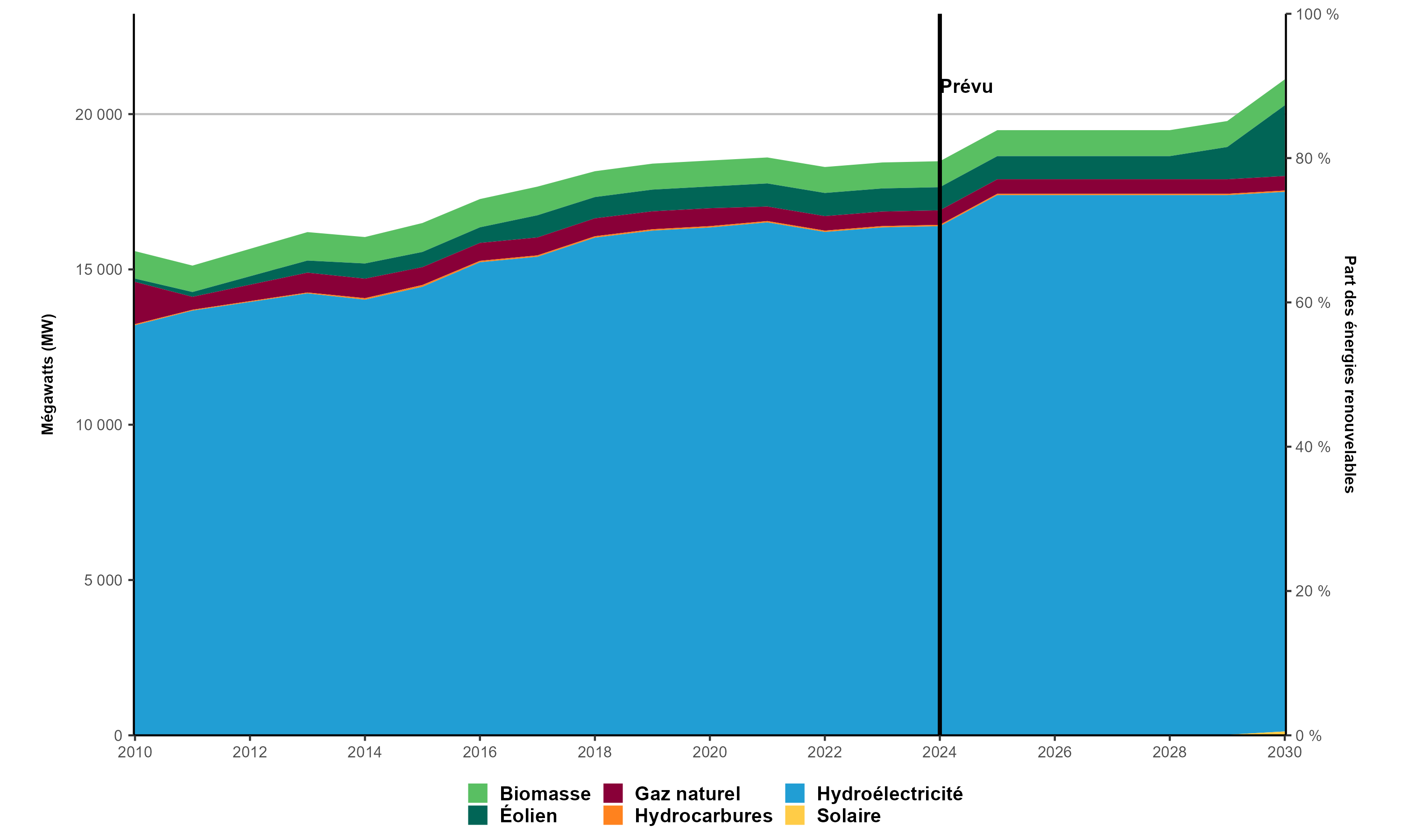 Version texte : Le graphique présente la capacité de production d’électricité en Colombie‑Britannique de 2010 à 2030. En 2010, la capacité installée totale de production d’électricité de la province s’établissait à 15 588 MW, dont 91,0 % à partir d’énergies renouvelables. En 2023, elle a atteint 18 443 MW (97,2 % d’énergies renouvelables). Selon les ajouts prévus, la capacité devrait atteindre 21 118 MW (97,6 % provenant d’énergies renouvelables) en 2030.