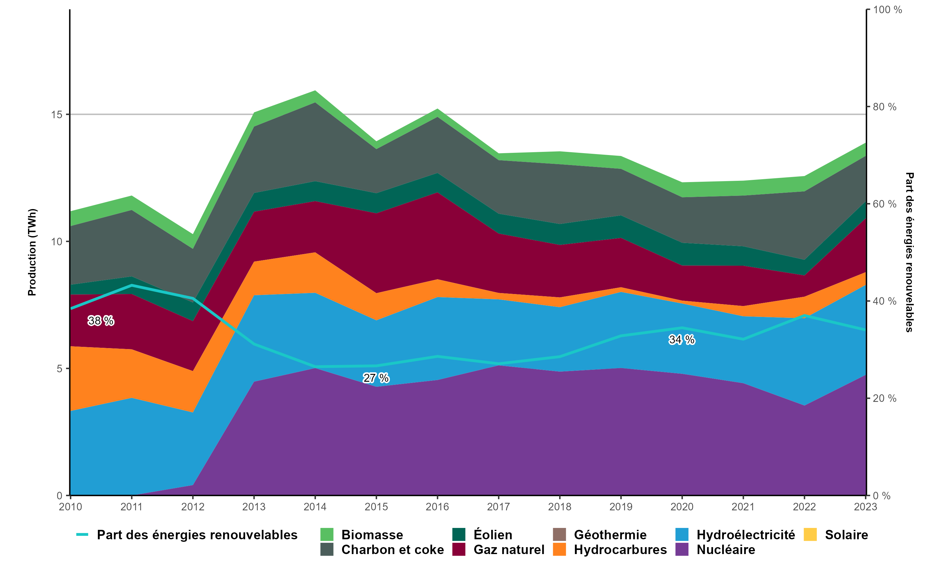 Version texte : Le graphique présente la production d’électricité au Nouveau-Brunswick de 2010 à 2023. En 2010, la production totale d’électricité du Nouveau‑Brunswick s’établissait à 11,2 TWh, dont 38,4 % à partir d’énergies renouvelables. En 2023, elle atteignait 13,9 TWh (34 % provenant d’énergies renouvelables). La même année, la plus grande partie de la production provenait du nucléaire (34,2 %), de l’hydroélectricité (25,5 %), du gaz naturel (15,3 %), du charbon (12,9 %) et de l’éolien (4,8 %).