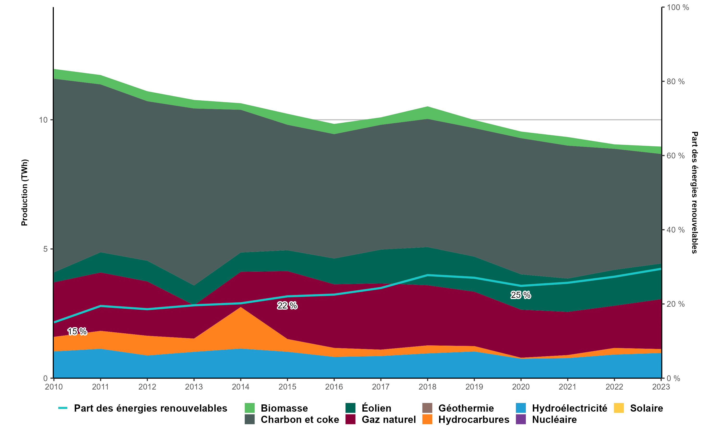 La consommation de charbon a diminué, passant de 63 % en 2010 à 47 % en 2023, et d’autres réductions sont prévues en raison de la mise hors service de centrales au charbon et de l’augmentation de la production d’énergie renouvelable. Le gaz naturel continue de fournir une capacité de pointe.