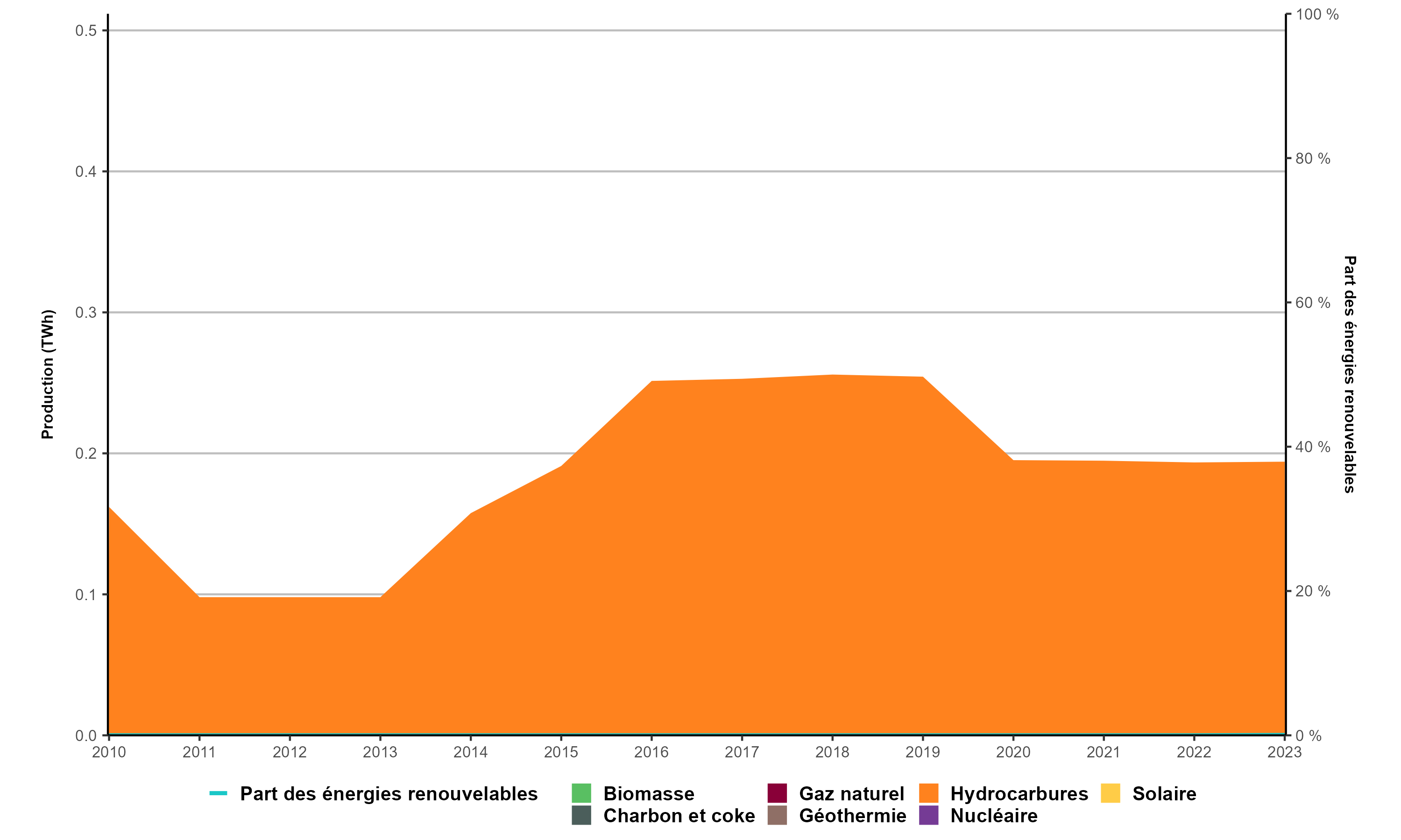 En 2023, le territoire disposait d’une capacité de production d’énergie solaire décentralisée de 0,8 MWNote de bas de page 10Note de bas de page 11.