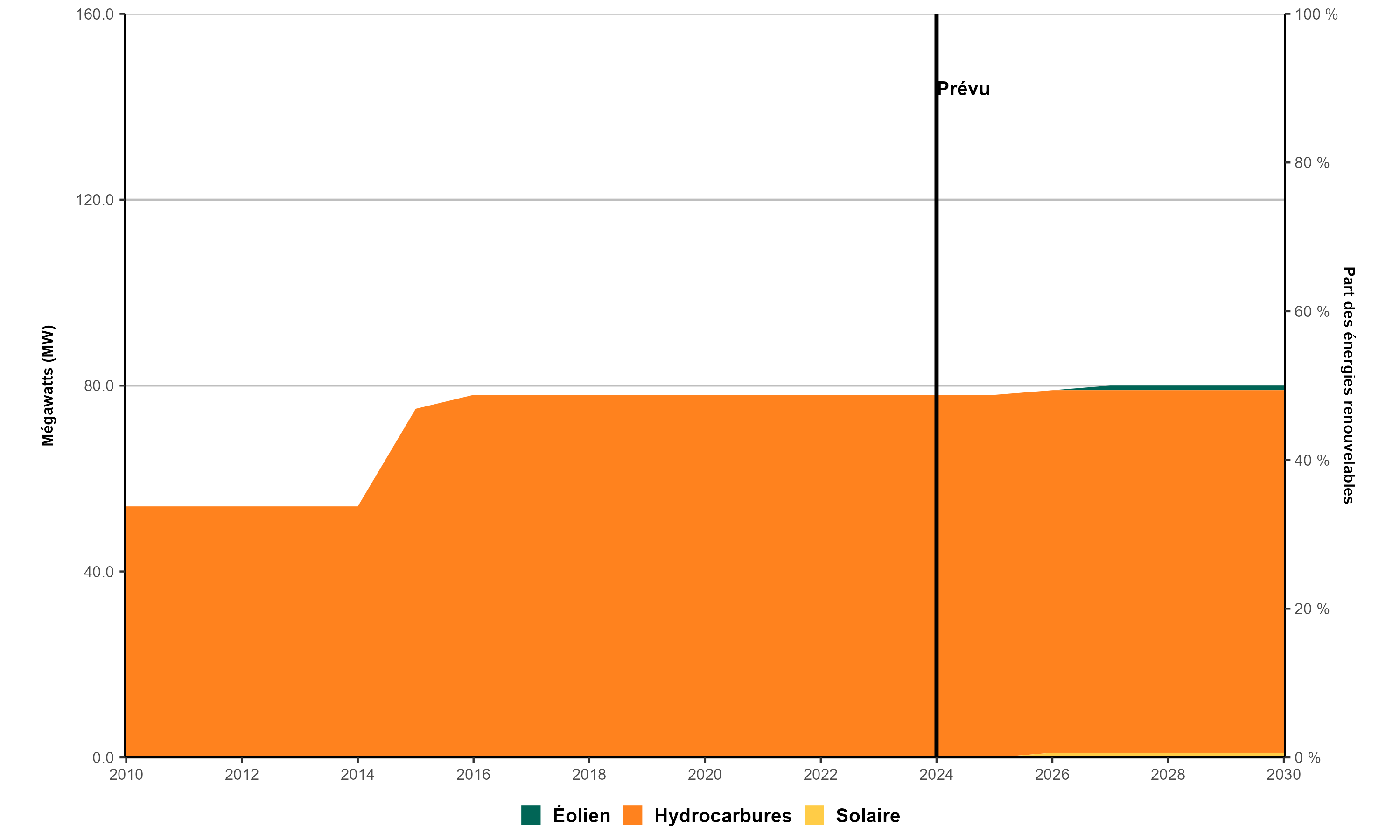 Version texte : Le graphique présente la capacité de production d’électricité au Nunavut de 2010 à 2030. En 2010, la capacité installée totale de production d’électricité de la province s’établissait à 54 MW (0,0 % à partir d’énergies renouvelables). En 2023, cette capacité avait augmenté pour passer à 78 MW (0,0 % provenant d’énergies renouvelables). Selon les ajouts prévus, la capacité devrait atteindre 80 MW (dont 2,5 % à partir d’énergies renouvelables) en 2030.