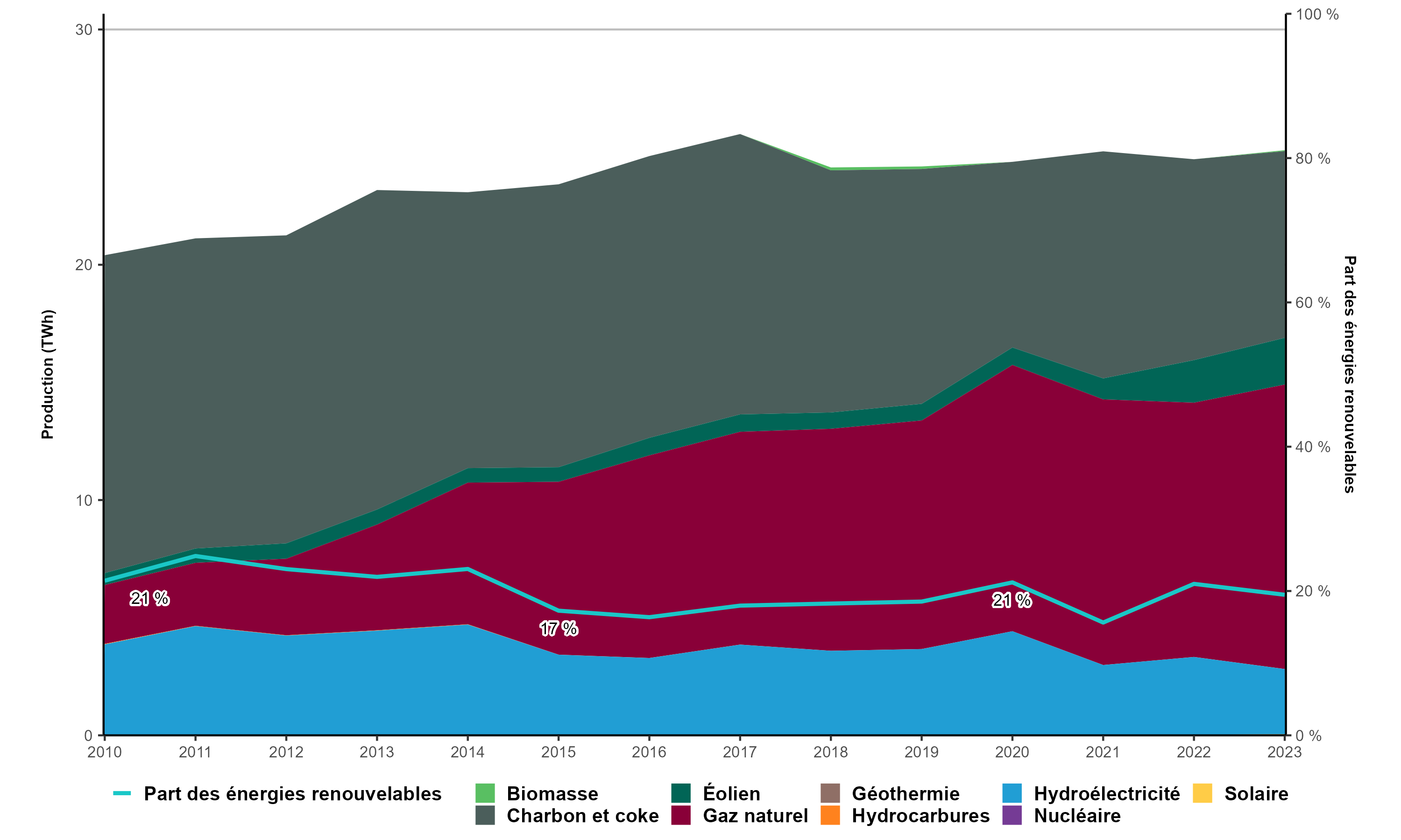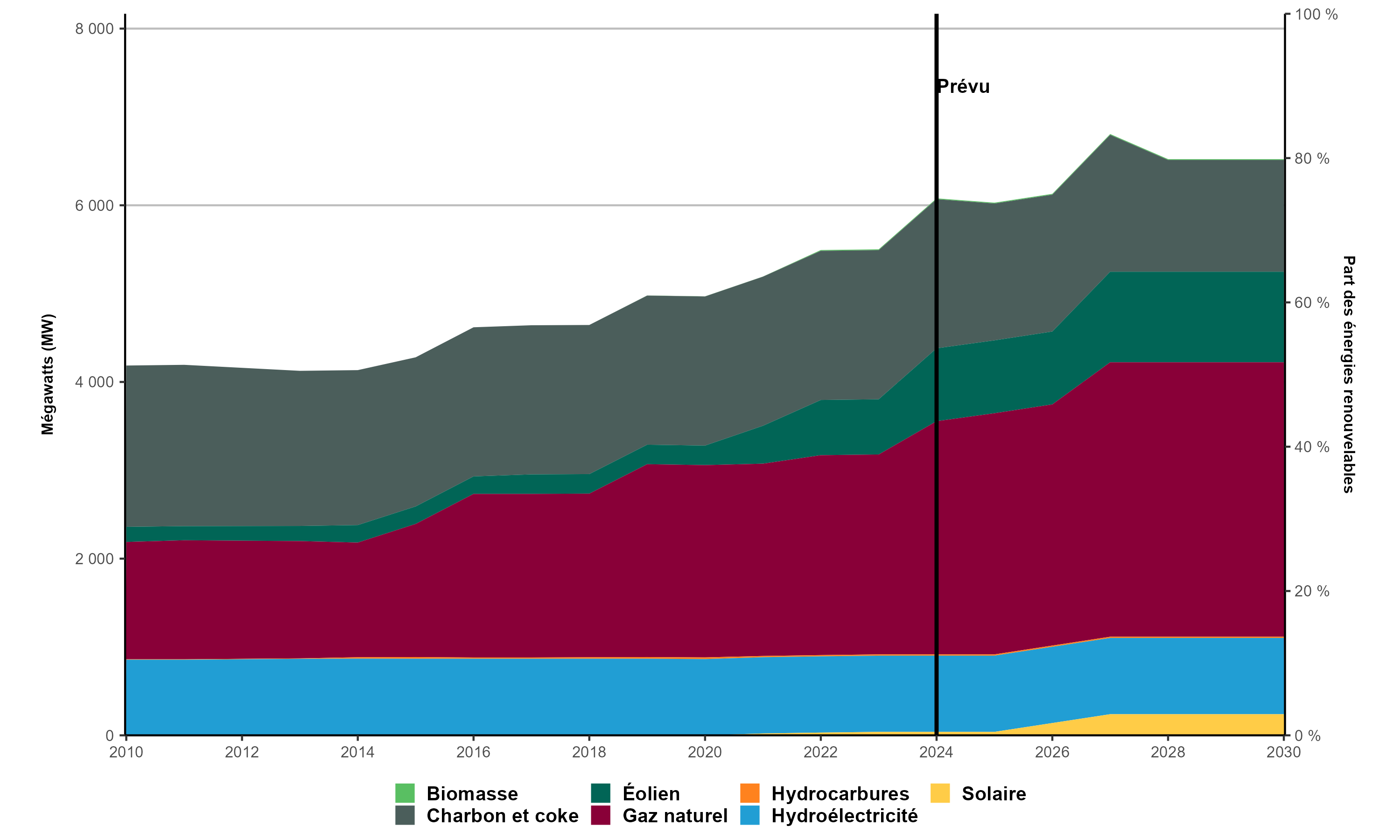 - La capacité de production à partir d’énergies renouvelables est passée de 1 027 mégawatts (« MW ») en 2010 à 1 537 MW en 2023, soit une augmentation de 49,6 %. Cette croissance était principalement attribuable à l’éolien (454 MW), à l’énergie solaire (39 MW) et à la biomasse (10 MW).