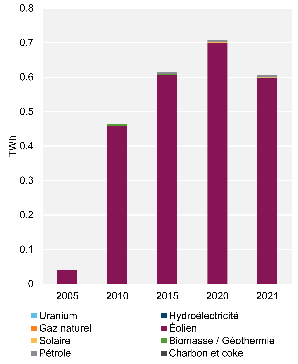 Texte de remplacement : Ce diagramme illustre la production d’électricité selon la source de L’Île-du-Prince-Édouard de 2005 à 2021.