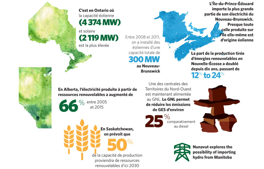 On retrouve, dans quatre provinces et territoires, des bouquets énergétiques variés regroupant le nucléaire, le charbon, le gaz, le pétrole et les énergies renouvelables dans diverses proportions. En 2015, la part des énergies renouvelables par rapport à la production totale s’établissait à 34 % en Ontario, 28% au Nouveau-Brunswick, 24 % en Nouvelle-Écosse et 38 % aux Territoires du Nord-Ouest.