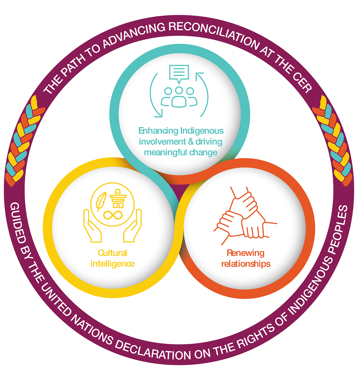 The visual representation of the CER’s Path to Advancing Reconciliation is shown by three smaller intertwined circles in a triangular arrangement, positioned inside one larger circle. Each of the three smaller circles surrounds an icon that represent a focus area for the CER: first, a blue circle represents ‘Enhancing Indigenous involvement & driving meaningful change’; second, a yellow circle represents ‘Cultural intelligence’; and lastly, an orange circle represents ‘Renewing relationships’. None of the circles close, rather each connects and feeds into the neighboring circle, representing the interconnectedness of each of the focus areas. The colors acknowledge Indigenous peoples’ connection to, and intimate relationship with, the elements of nature (blue symbolizing water, orange - earth or fire, and yellow – wind). The outer circle, dark purple in color depicts how the CER is weaving the United Nations Declaration on the Rights of Indigenous Peoples into everything that they do and encompasses braids that weave together blue, yellow and orange. The purple color also shadows the inner circles which further demonstrate that the UN Declaration in woven into all the CER’s actions towards Reconciliation. Taken as a whole, the image portrays how the CER views its journey towards Reconciliation.
