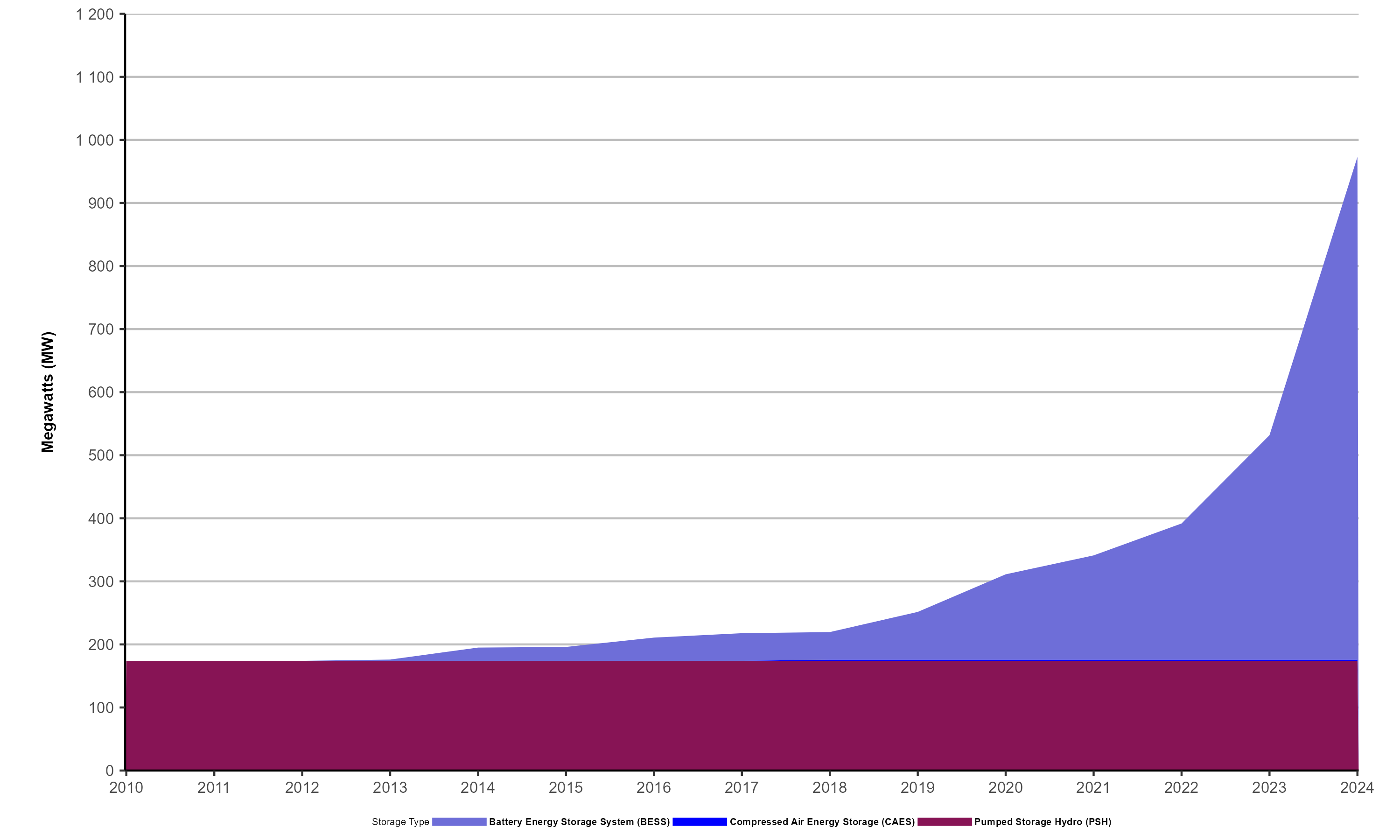 Text Alternative: This graph illustrates energy storage capacity from 2010 to 2024 across Canada. The storage types considered are battery energy storage system (BESS), compressed air energy storage (CAES), and pumped hydro storage (PSH). PSH remained steady at around 170 MW. BESS has seen significant growth starting in the mid-2010s, and made up most of energy storage capacity in 2024. Other storage types remain marginal.