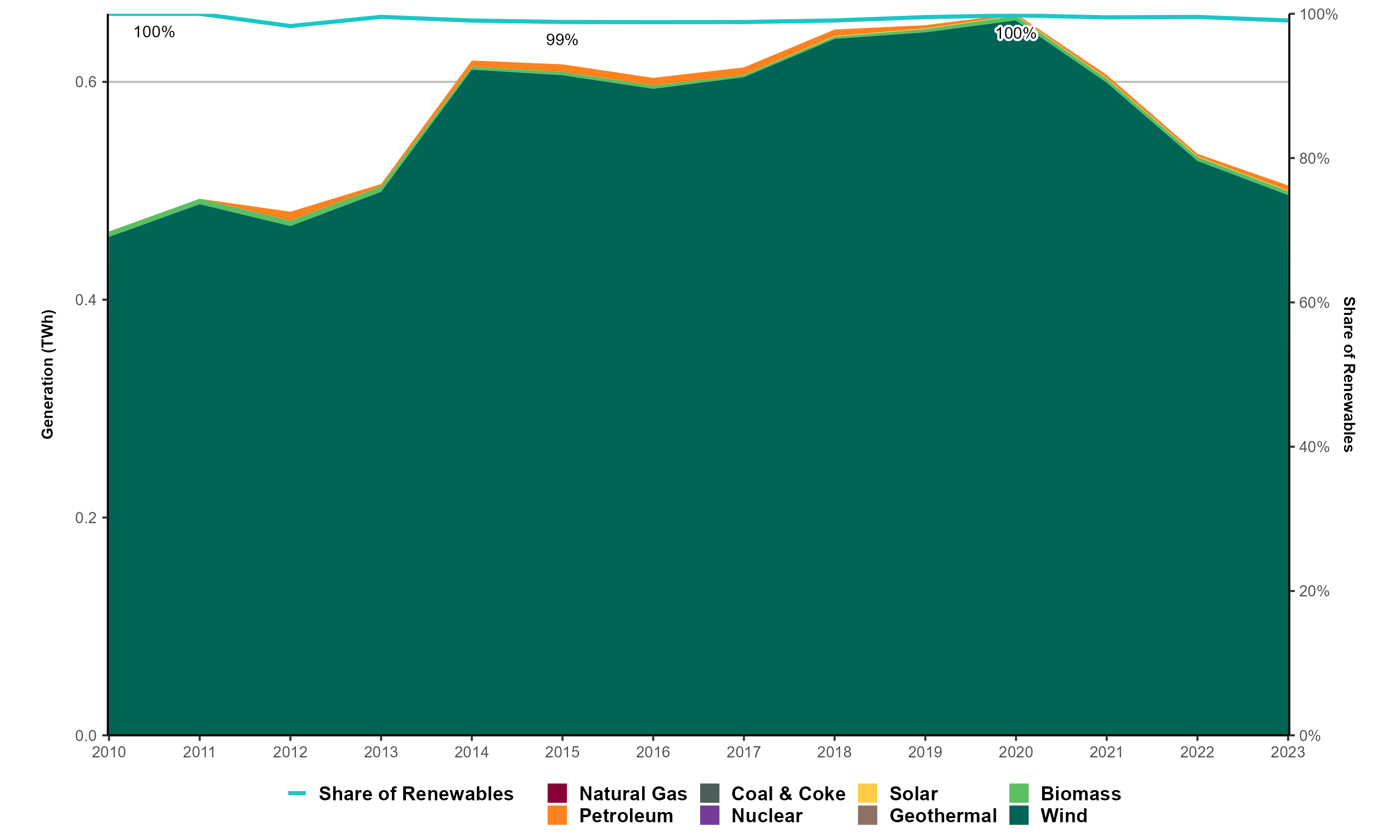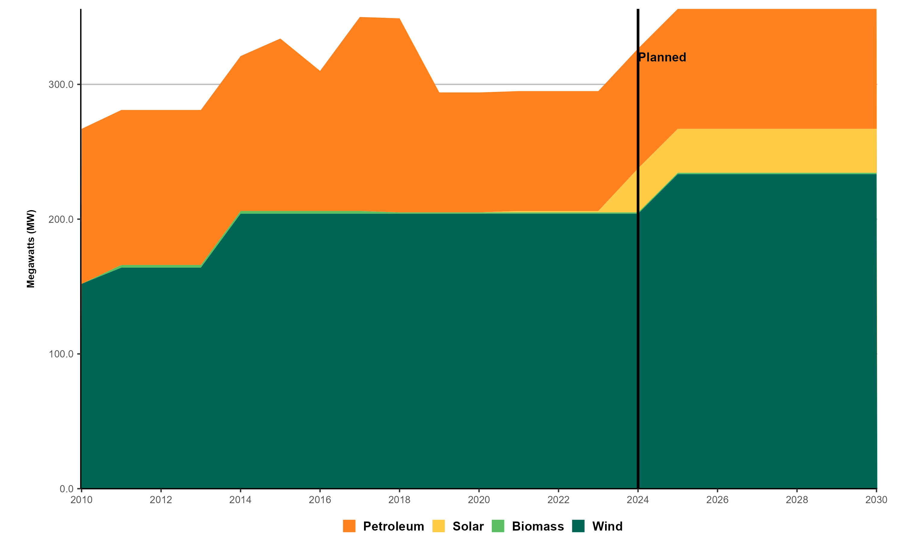 - Renewable capacity grew from 267 megawatts (MW) in 2010 to 295 MW in 2023, a 10.5% increase. Most of this growth came from wind (52 MW), while biomass went from zero to 1 MW, and solar from 0 to 1 MW. Over that time period, petroleum-fired generators declined from a capacity of 115 MW to 89 MW.