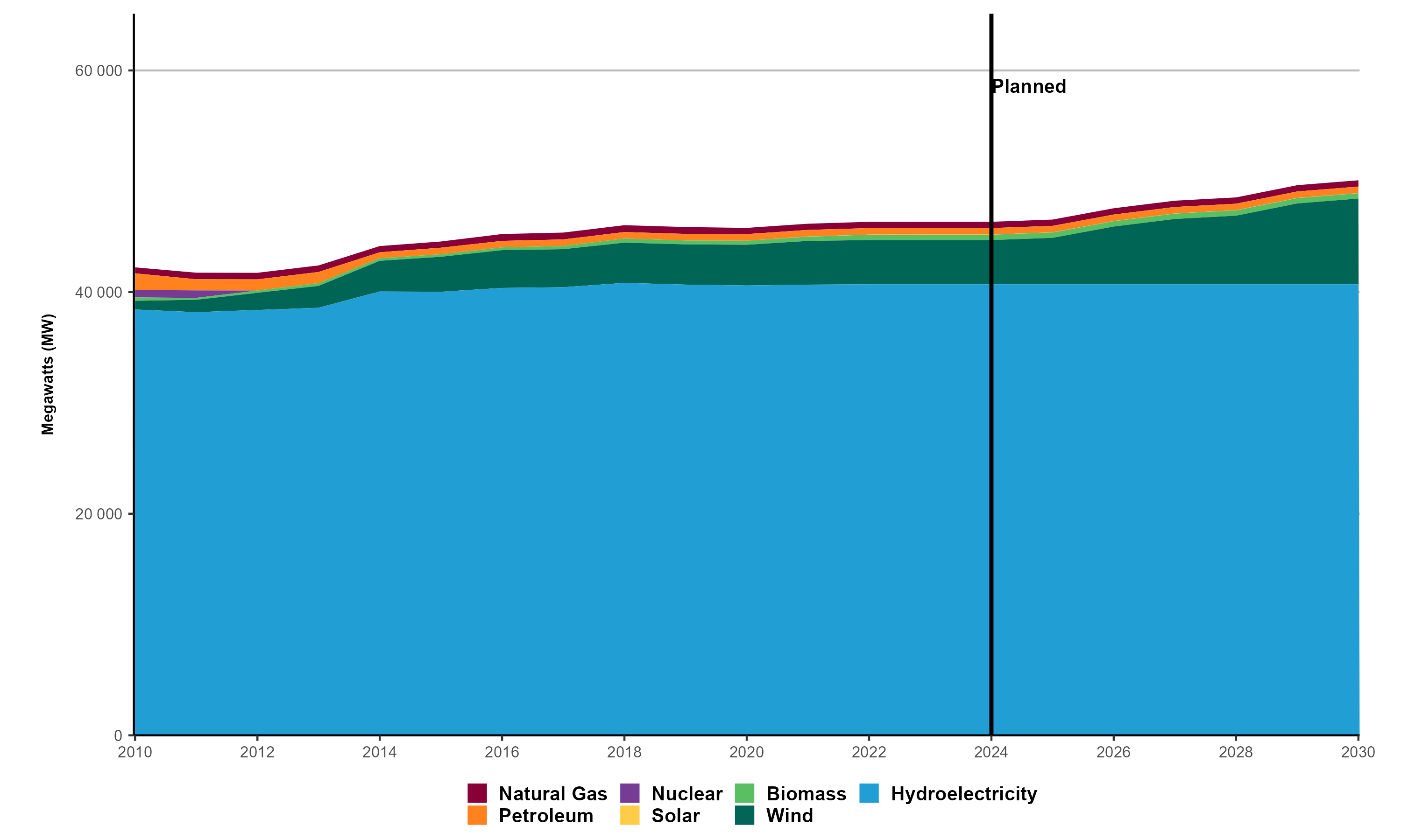 Text Alternative: This graph illustrates historical electricity generation capacity from 2010 to 2030 in Quebec. In 2010, the province’s total installed electricity capacity was 42,230 MW (94.0% renewable). In 2023, capacity had grown to 46,343 MW (97.5% renewable). In 2030, based on planned capacity additions, capacity reaches 50,088 MW (97.7% renewable).