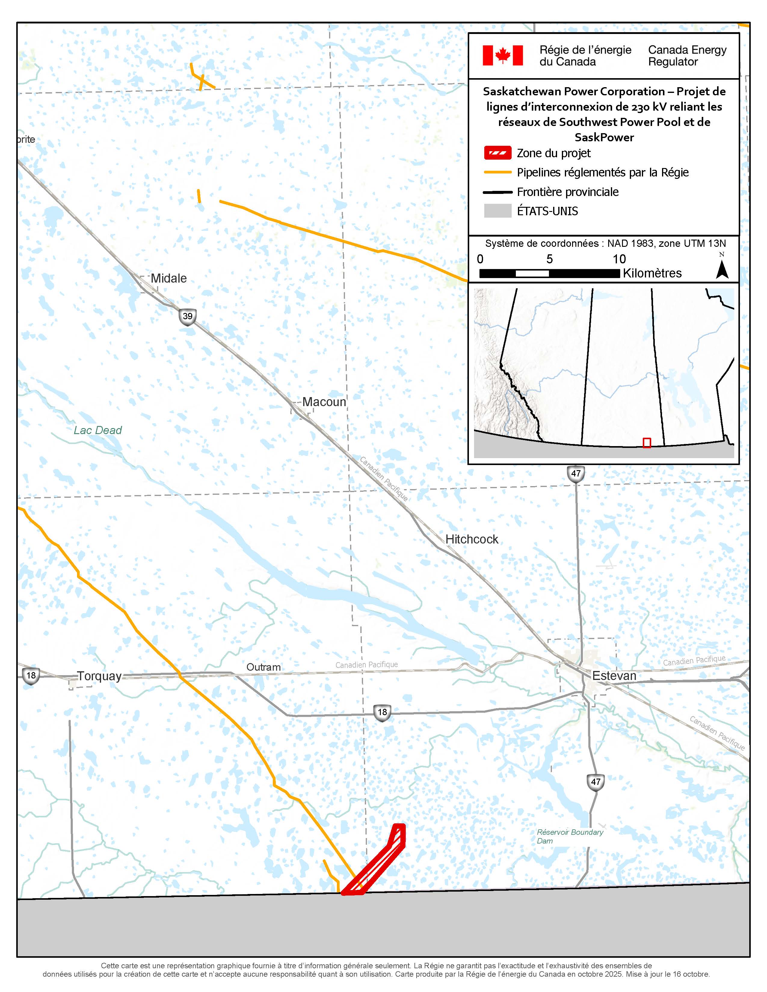 Saskatchewan Power Corporation a présenté une demande visant l’obtention de deux permis pour le projet de « ignes d’interconnexion de 230 kV reliant les réseaux de Southwest Power Pool et de SaskPower » (« projet »). Le projet envisagé prévoit la construction et l’exploitation de la partie canadienne de deux nouvelles lignes internationales de transport d’électricité (« LIT ») situées à environ 15 km au sud-ouest d’Estevan, en Saskatchewan, dans les municipalités rurales d’Estevan no 5 et de Cambria no 6, sur des terres privées qui ont surtout une vocation agricole. Le projet envisagé relierait SaskPower de son poste de sectionnement de Tableland, situé au sud-ouest d’Estevan, en Saskatchewan, à des installations aux États-Unis à deux points d’interconnexion à la frontière avec le Dakota du Nord, aux États-Unis. Le projet ne servirait qu’à importer de l’électricité vers la Saskatchewan. SaskPower s’attend toutefois à ce que le projet permette ultérieurement d’exporter de l’électricité. Le coût des composantes du projet au Canada est estimé à 117,2 millions de dollars.