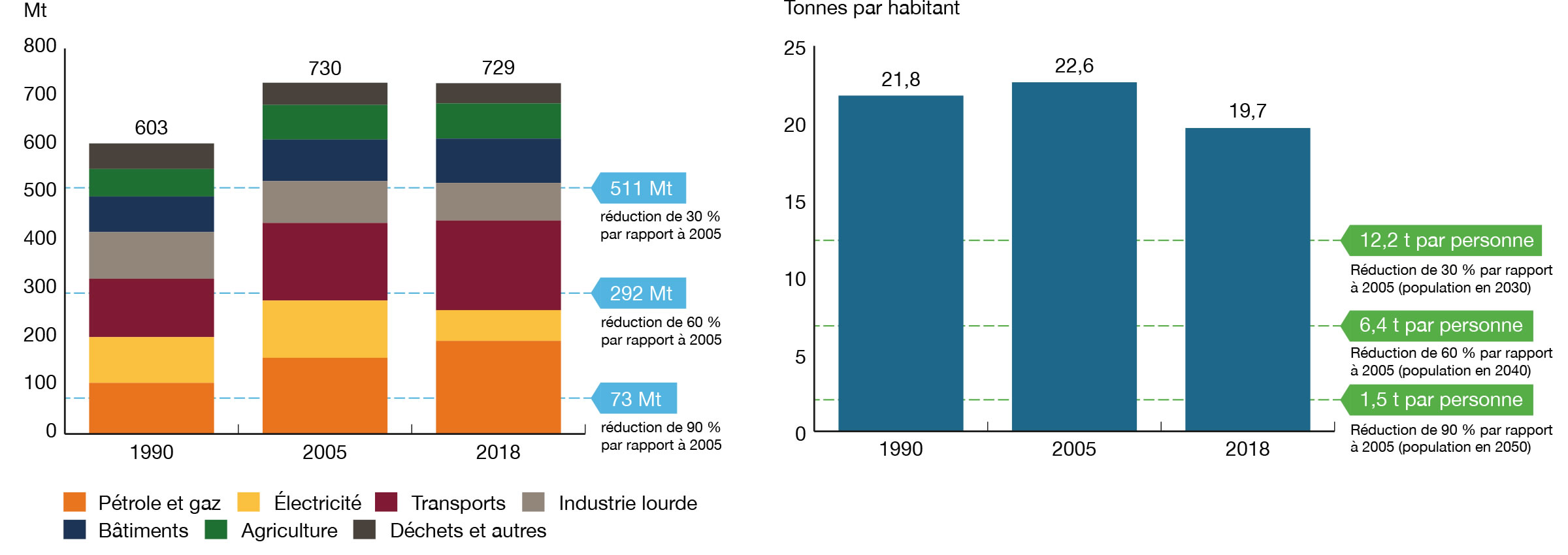 Le Canada a récemment dévoilé des engagements plus ambitieux en matière de changements climatiques, notamment le dépassement des cibles d’émissions de 2030 et l’atteinte de la carboneutralité en 2050. Sur la scène internationale, le mouvement vers la lutte contre les changements climatiques continue de s’accélérer, renforçant ainsi l’engagement pris à l’échelle mondiale dans l’Accord de Paris de 2015 d’atteindre la neutralité carbone dans la deuxième moitié du siècle27. Le plan du Canada pour atteindre cet objectif en 2050, toujours en cours d’élaboration, établira des cibles de réduction des émissions sur cinq ans juridiquement contraignantes, fondées sur des conseils d’experts et des consultations menées auprès des Canadiens28.