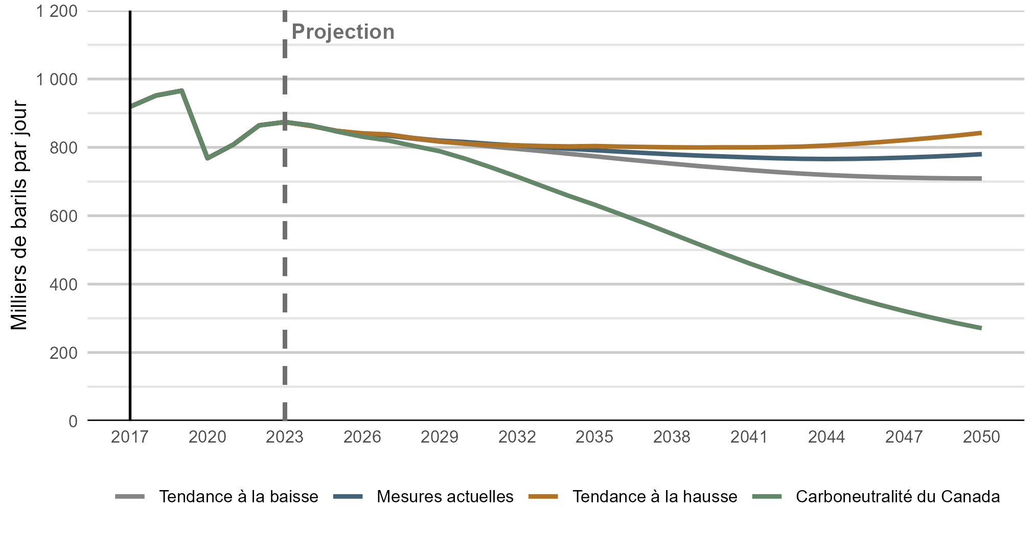Version texte : Ce graphique linéaire illustre la demande combinée de PPR en Ontario et au Québec, de 2017 à 2050, dans tous les scénarios, en milliers de barils par jour (« kb/j »). Dans les scénarios des mesures actuelles, de la tendance à la hausse et de la tendance à la baisse, la demande demeure relativement stable, ou diminue légèrement, au cours de la période de projection. Dans le scénario de carboneutralité du Canada, la demande diminue de façon constante tout au long de la période de projection, puis chute considérablement à l’approche de 2050.