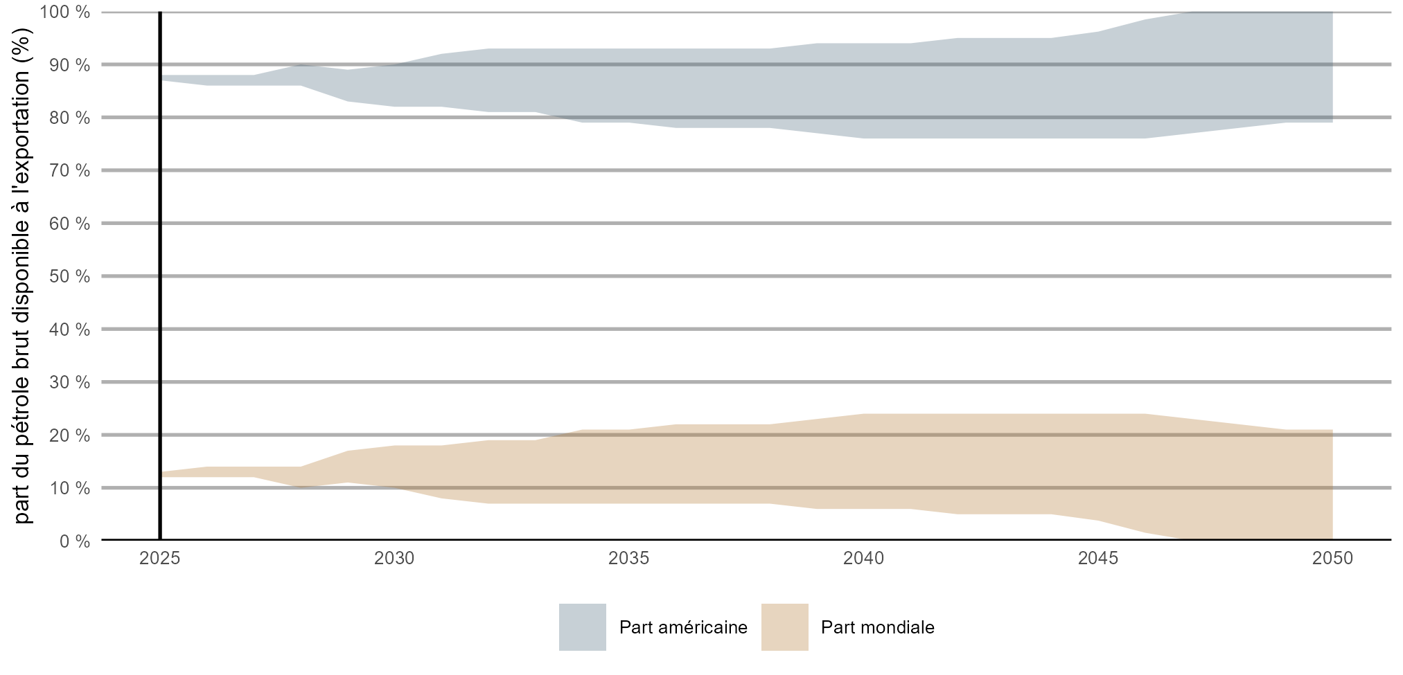 Version texte : Ce graphique illustre la fourchette potentielle des parts de marché du pétrole brut de l’Ouest canadien disponible à l’exportation. Il présente la fourchette pour les marchés mondiaux et américains sous forme de segments qui augmentent tous deux de 2025 à 2050. La fourchette représentant les marchés mondiaux passe d’environ 13 % en 2025 à un maximum d’un peu moins de 25 % et un minimum de zéro. La fourchette représentant les marchés américains passe d’environ 88 % en 2025 à un maximum de 100 % et un minimum de 76 %.