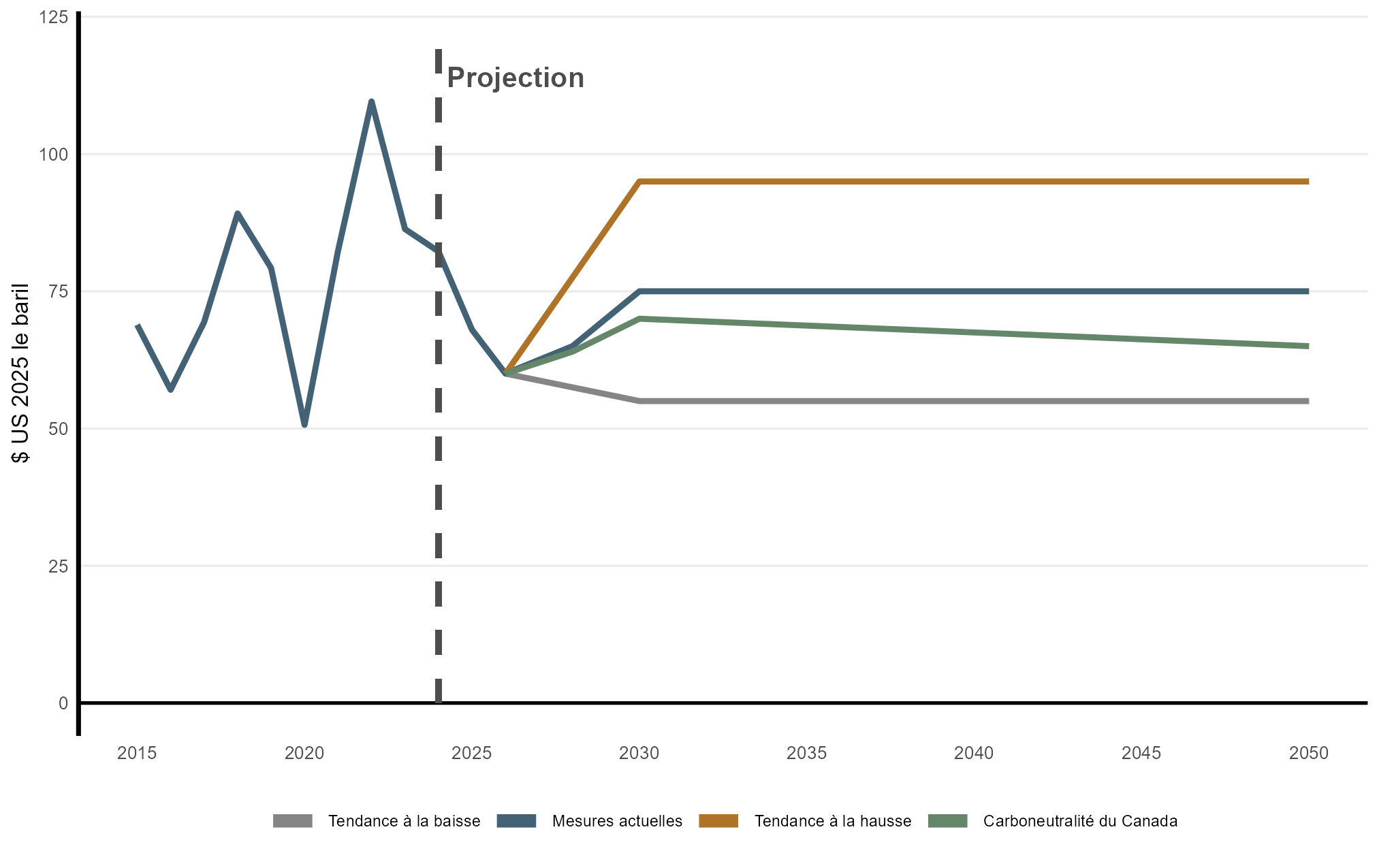 Version texte : Cette figure illustre les prix internationaux présumés du pétrole brut (Brent), exprimés en dollars américains de 2025 le baril, dans tous les scénarios. Les prix augmentent par rapport aux niveaux récents pour atteindre 75 $ le baril en 2030 dans le scénario des mesures actuelles, alors que les scénarios de la tendance à la hausse, de la tendance à la baisse et de carboneutralité du Canada prévoient des prix de 95 $, de 55 $ et de 70 $ le baril respectivement au cours de la même période de projection. Les prix demeurent constants en termes réels après 2030, sauf dans le scénario de carboneutralité du Canada, où ils baissent graduellement pour atteindre 65 $ le baril en 2050.