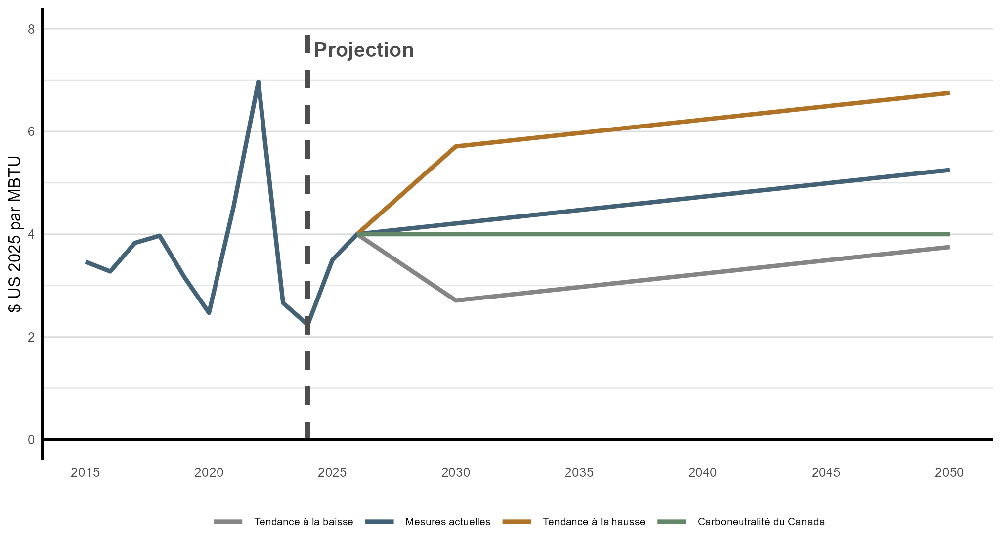 Version texte : Cette figure illustre les prix internationaux présumés du gaz naturel (au carrefour Henry), exprimés en dollars américains de 2025 par MBTU, dans tous les scénarios. Dans le scénario des mesures actuelles, le prix atteint environ 5,25 $ par MBTU en 2050. Dans le scénario de la tendance à la hausse, il augmente rapidement jusqu’en 2030, puis de façon plus régulière, pour atteindre 6,75 $ en 2050. Dans le scénario de la tendance à la baisse, il diminue à environ 2,75 $ par MBTU en 2030, puis augmente de nouveau pour atteindre presque les niveaux de 2026 en 2050. Dans le scénario de carboneutralité du Canada, il reste stable à 4 $ par MBTU tout au long de la période de projection.