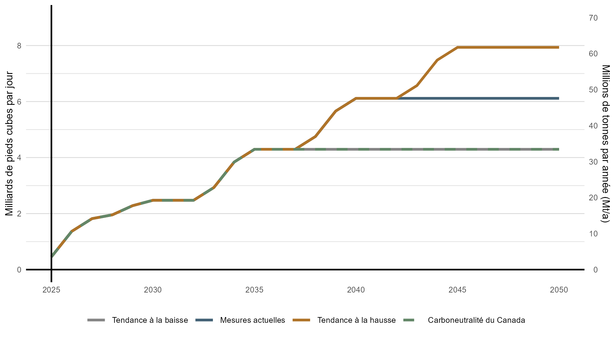 Version texte : Cette figure illustre les volumes d’exportation de GNL canadien présumés dans tous les scénarios. Les exportations augmentent progressivement à compter de 2025, les projets initiaux étant mis en service. Dans le scénario de la tendance à la baisse, les volumes atteignent 4,25 Gpi³/j en 2035 et demeurent stables pendant le reste de la période de projection. Le scénario des mesures actuelles suit la même trajectoire, puis les volumes atteignent 6 Gpi³/j en 2040. Le scénario de la tendance à la hausse suit la même trajectoire que le scénario des mesures actuelles jusqu’en 2035, après quoi il y a une croissance supplémentaire qui fait passer les volumes à 8 Gpi³/j en 2045. Dans le scénario de carboneutralité du Canada, les niveaux sont identiques à ceux du scénario de la tendance à la baisse. Les volumes d’exportation demeurent constants après avoir atteint leur sommet dans chaque scénario.