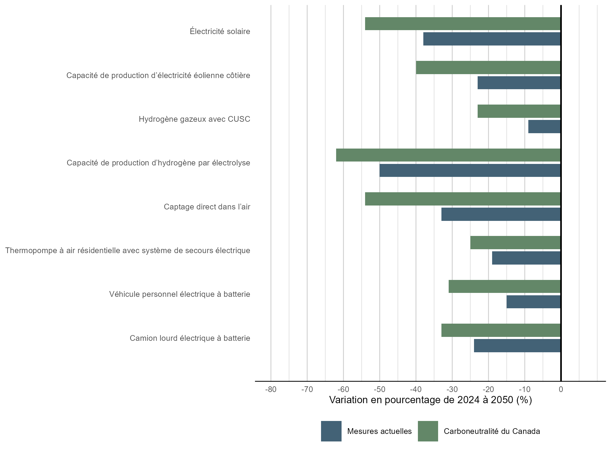 Version texte : Cette figure illustre la diminution présumée en pourcentage des coûts en capital pour certaines technologies énergétiques propres, de 2024 à 2050, dans les scénarios des mesures actuelles et de carboneutralité du Canada. Pour l’ensemble de ces technologies, les coûts diminuent plus fortement dans le scénario de carboneutralité du Canada, à des degrés divers.