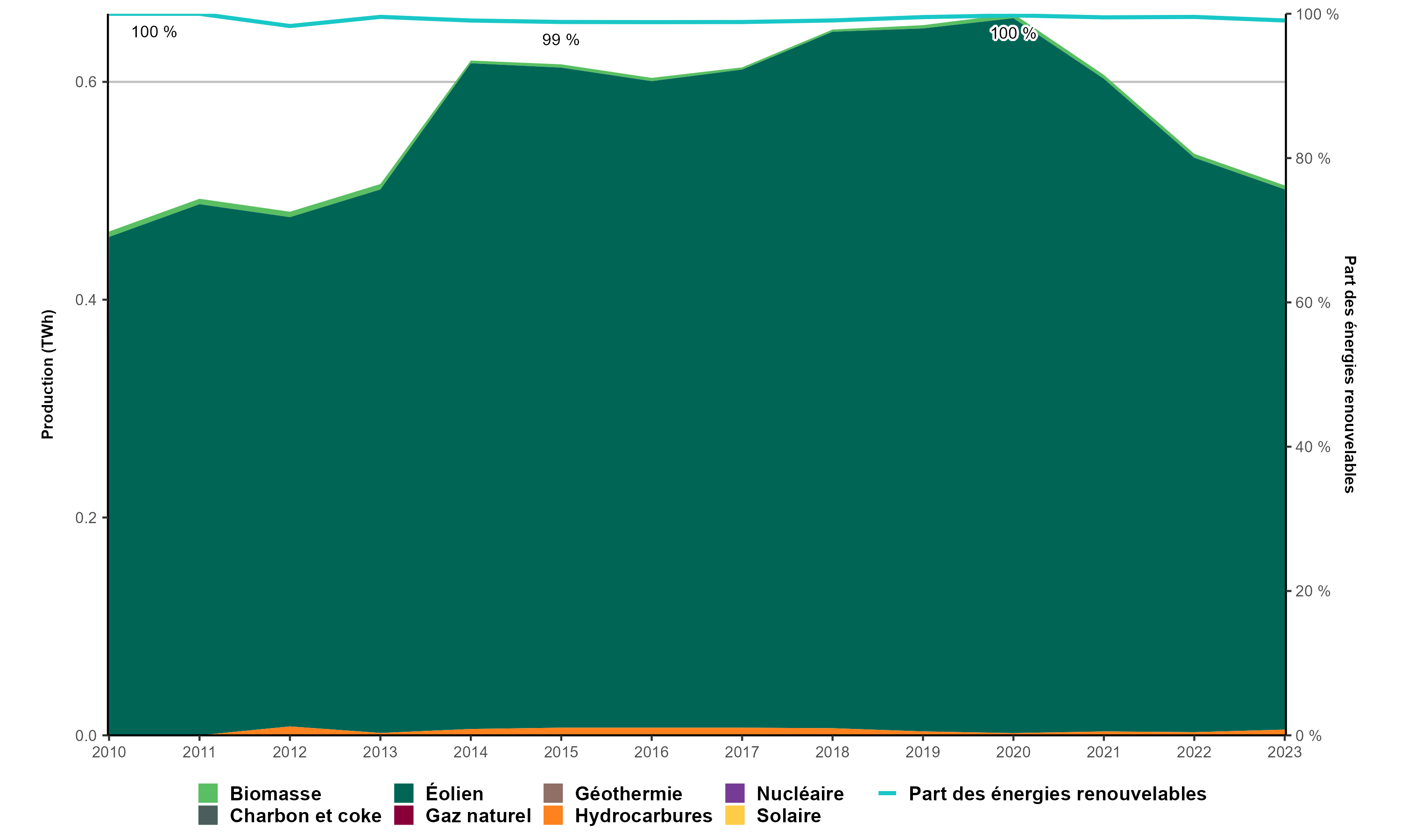 Version texte : Le graphique présente la production d’électricité à l’Île-du-Prince-Édouard de 2010 à 2023. En 2010, la production totale d’électricité de l’Île-du-Prince-Édouard s’établissait à 462,6 GWh (100,0 % à partir d’énergies renouvelables). En 2023, elle atteignait 504,9 GWh, dont 99,1 % provenant d’énergies renouvelables. La même année, la plus grande partie de la production provenait de l’éolien (98,2 %), du pétrole (0,9 %) et de la biomasse (0,7 %).
