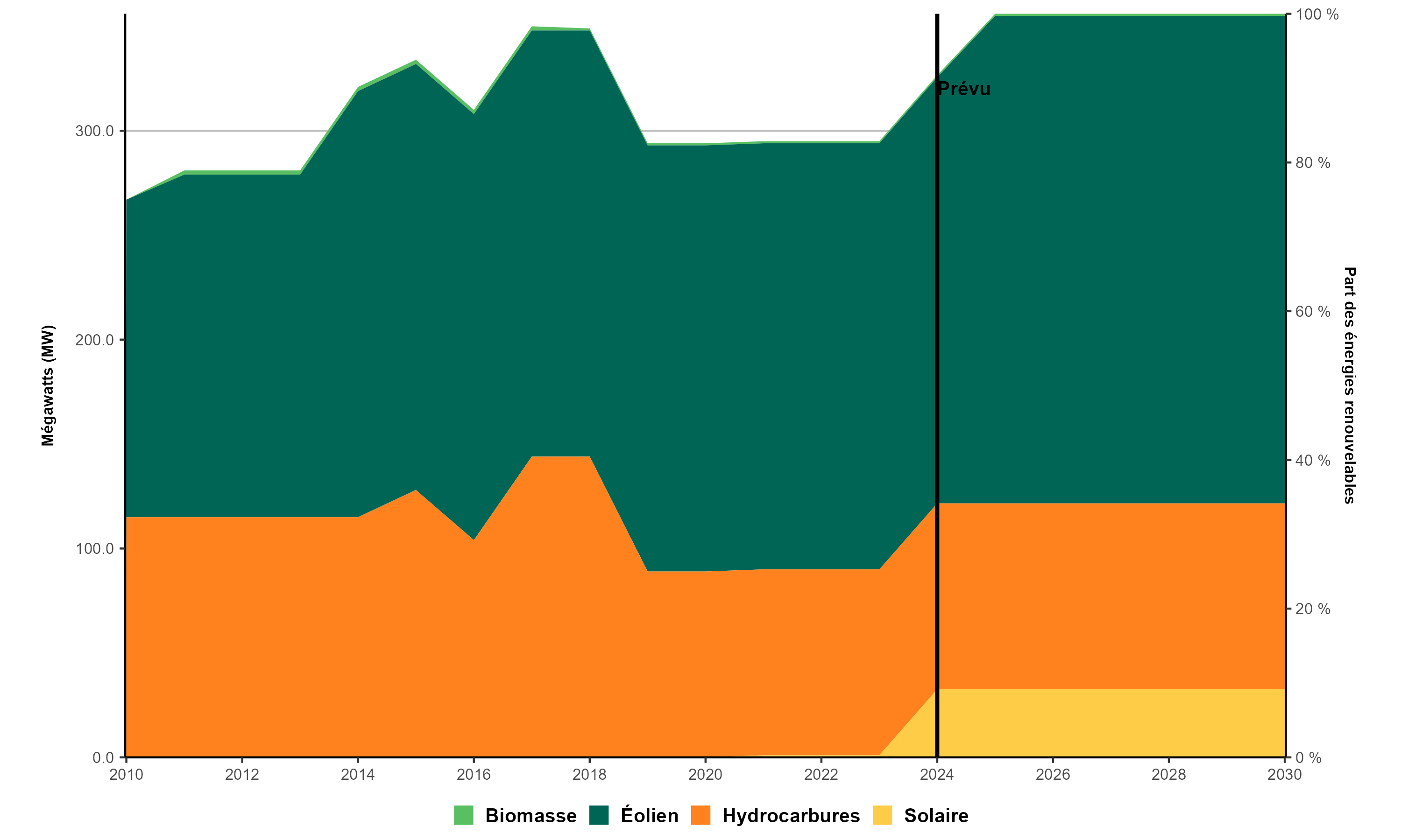 Version texte : Le graphique présente la capacité de production d’électricité à l’Île‑du‑Prince-Édouard de 2010 à 2030. En 2010, la capacité installée totale de production d’électricité de la province s’établissait à 267 MW, dont 56,9 % à partir d’énergies renouvelables. En 2023, elle a atteint 295 MW (69,8 % d’énergies renouvelables). Selon les ajouts prévus, la capacité devrait atteindre 356 MW (75,0 % à partir d’énergies renouvelables) en 2030.