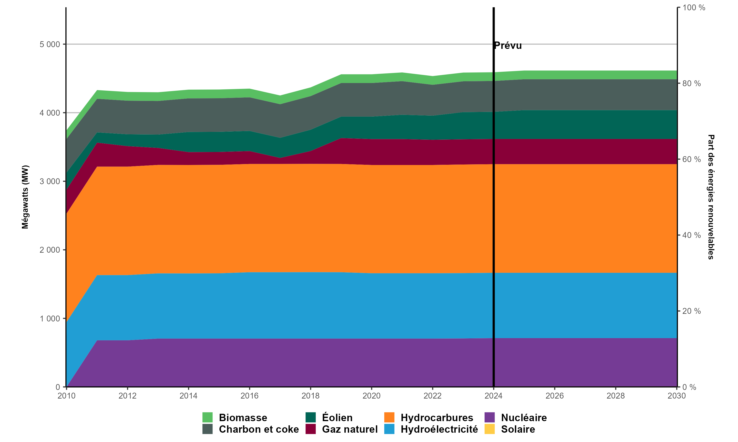 • La capacité de production à partir d’énergies renouvelables est passée de 1 323 mégawatts (« MW ») en 2010 à 1 478 MW en 2023, une augmentation de 11,7 %. Cette augmentation est presque entièrement attribuable à l’accroissement de la capacité éolienne (147 MW).